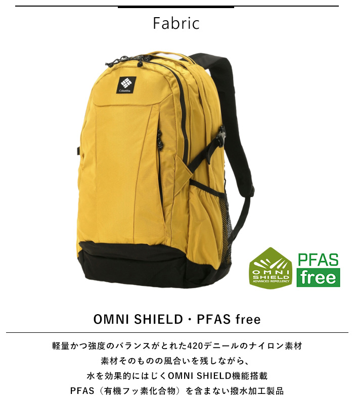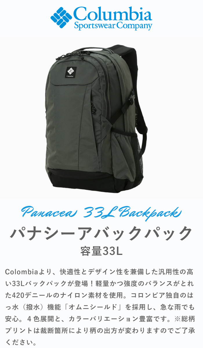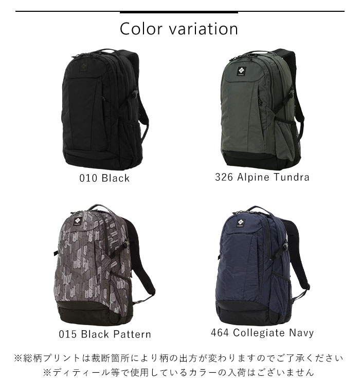 | 商品説明 | ・コロンビア独自のはっ水(撥水)機能「オムニシールド」 ・アウトドアや日常使いと汎用性の高いバックパック ・軽量かつ強度のバランスがとれた420デニールのナイロン素材 ・メインコンパートメント内部にPC(15インチ)対応のクッション入りオープンポケット ・セカンドコンパートメント内部に2つの小物用スリーブポケット ・背面にセキュリティーポケット ・クッション性と通気性に優れたWave Pad仕様の背面構造 ・夜間の視野性の考慮した、リフレクター入り引手コード ・取外し式チェストストラップ ・容量33L ・マルチカラー配色デザイン(014カラー Black Multi)展開あり ・コロンビアオリジナルパターン柄(015カラー Black Pattern)展開あり ※総柄プリントは裁断箇所により柄の出方が変わりますのでご了承ください |