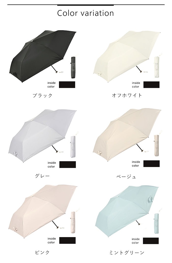 無駄のないシンプルな無地のデザインは、幅広いスタイルにも合わせていただけます。全6色のカラーリングはトレンドを押さえた色を揃え、好みに合わせてお選びいただけます。手元やストラップもオフホワイトで統一してクリーンなイメージです。裏側のポリウレタン加工の色はブラックになっています。ダークな色は光を吸収し日陰を作る効果があり、強い日差しに最適です。
