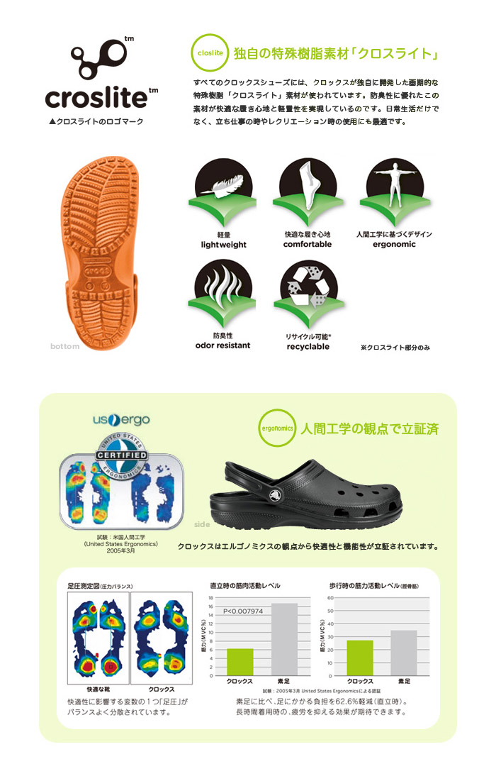 『Walk in comfort, Wear in style』2002年11月のファーストモデルの発売以来、クロックスは商品ラインを拡大し続け、年間を通じてより幅広いシーンに対応できるバリエーションを提案しております。ワクワクするようなカラーと革新的なデザインを融合したライフスタイルブランドとして、新たな快適性、機能性、スタイルを提供させて頂くショップです。