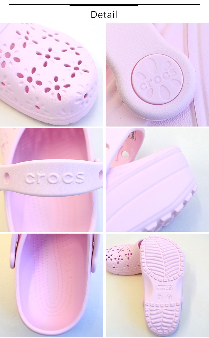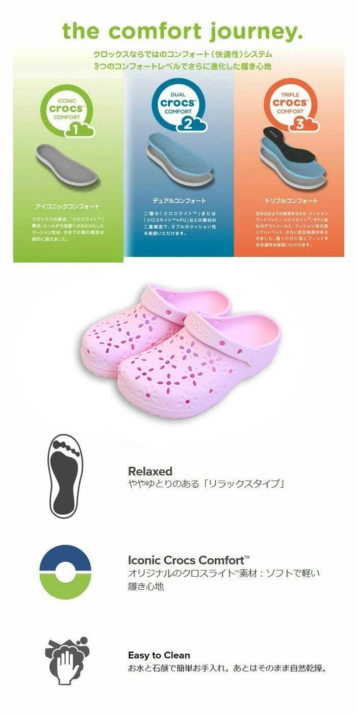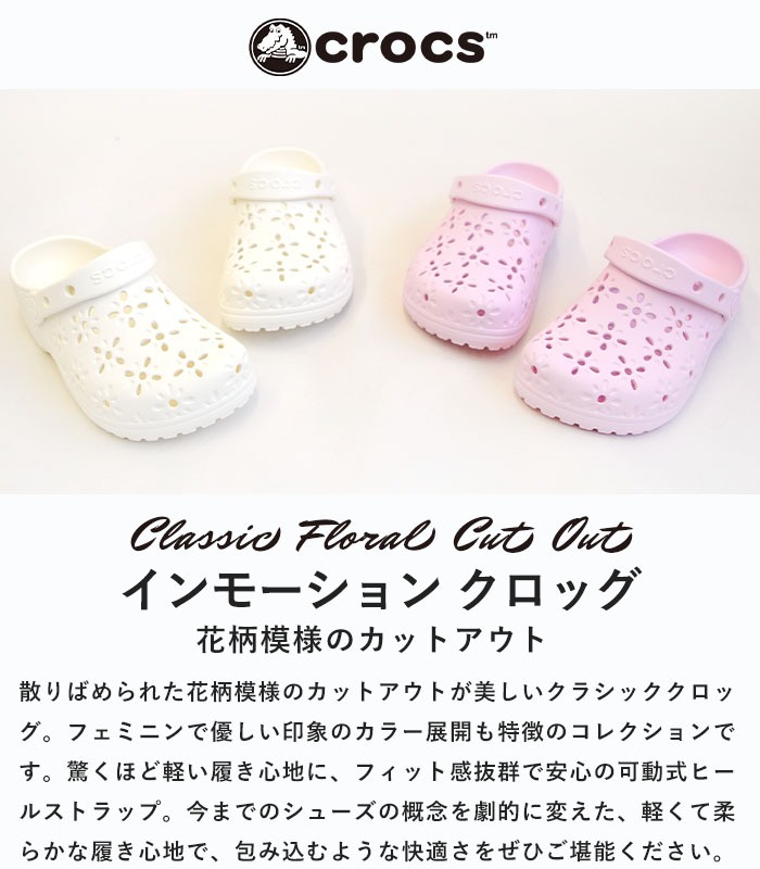 商品説明 散りばめられた花柄模様のカットアウトが美しいクラシッククロッグ。フェミニンで優しい印象のカラー展開も特徴のコレクションです。驚くほど軽い履き心地に、フィット感抜群で安心の可動式ヒールストラップ。通気性をアップし、中に入った水やゴミが払いやすい通気孔や、お手入れのしやすさもポイントです。今までのシューズの概念を劇的に変えた、軽くて柔らかな履き心地の“アイコニックコンフォート”で、包み込むような快適さをぜひご堪能ください。