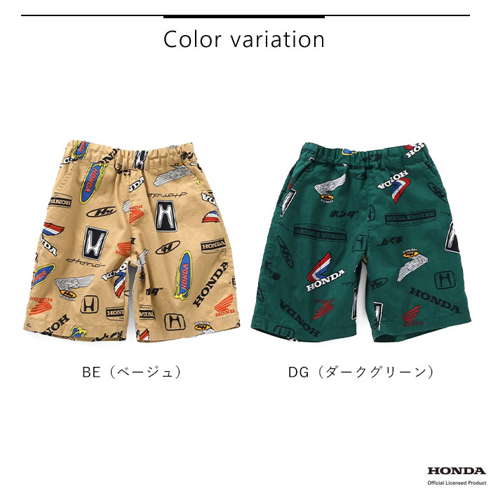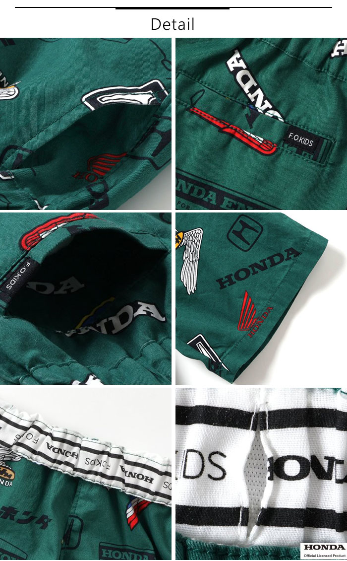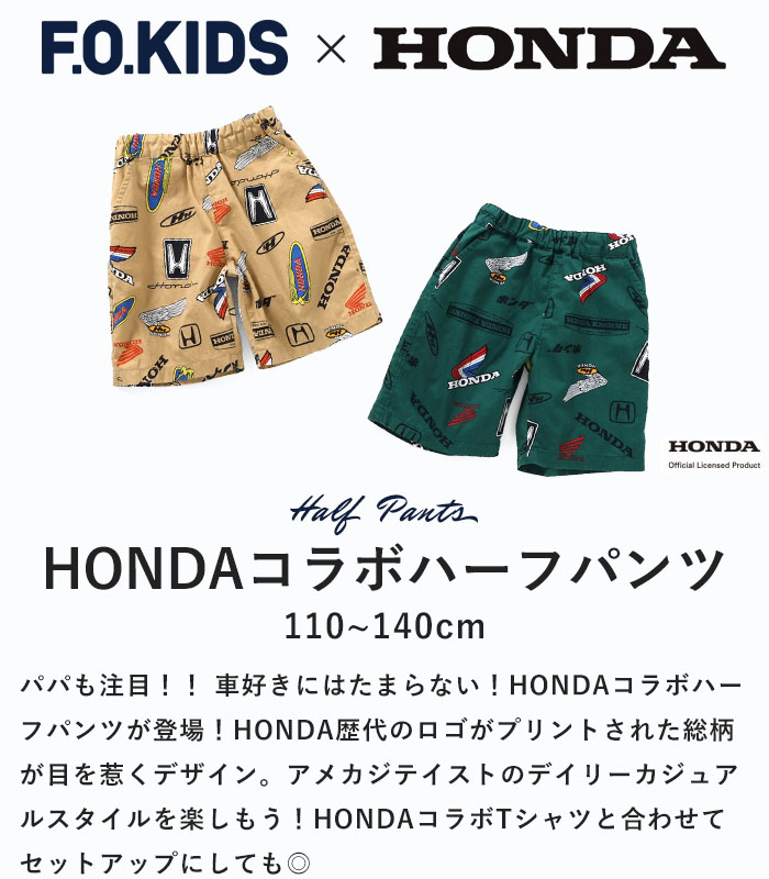 商品説明 パパも注目!! 車好きにはたまらない!HONDAコラボハーフパンツが登場!HONDA歴代のロゴがプリントされた総柄が目を惹くデザイン。アメカジテイストのデイリーカジュアルスタイルを楽しもう!HONDAコラボTシャツと合わせてセットアップにしても◎