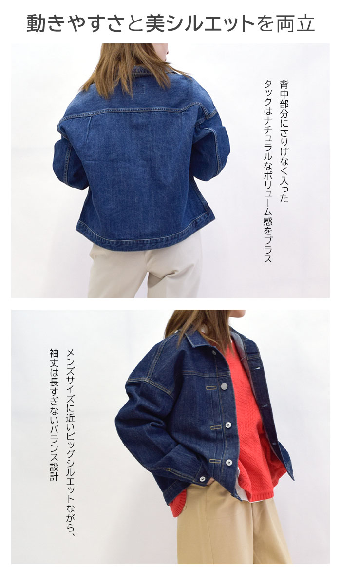 メンズサイズに近いビッグシルエットながら、袖丈は長すぎないバランス設計のデニムジャケットです。
