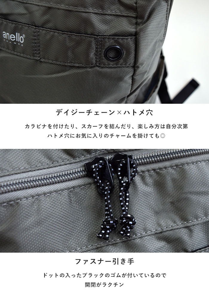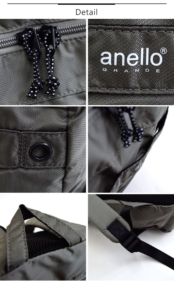 フロントのanello GRANDEのロゴが入ったテープ生地にはハトメ穴が付いていて