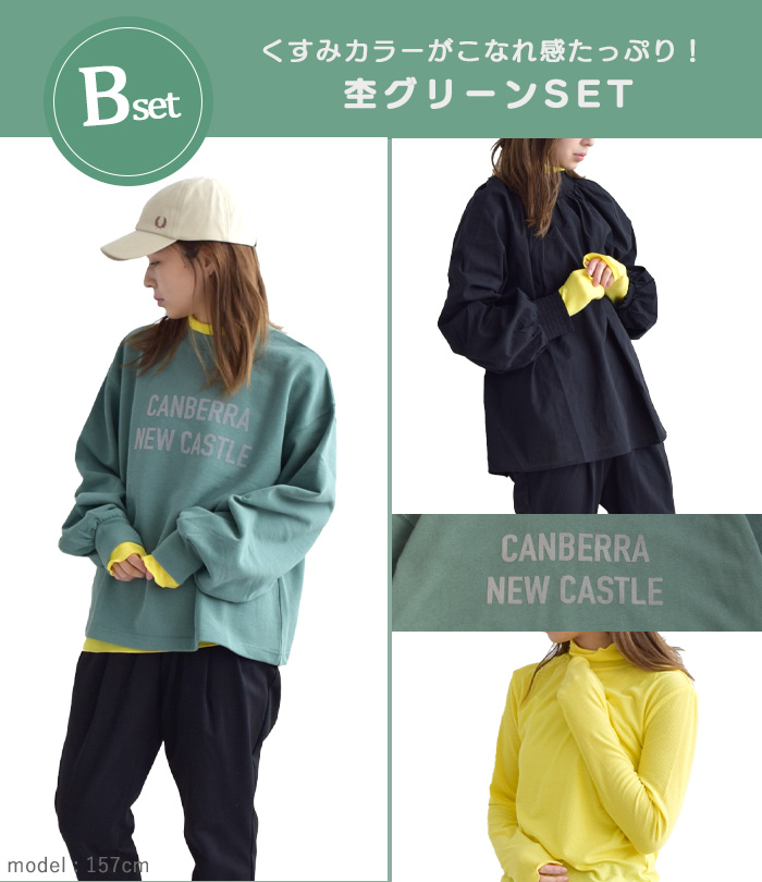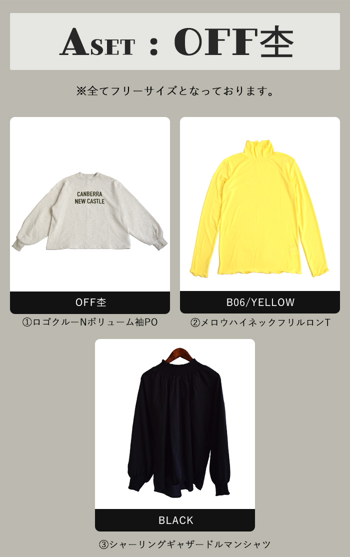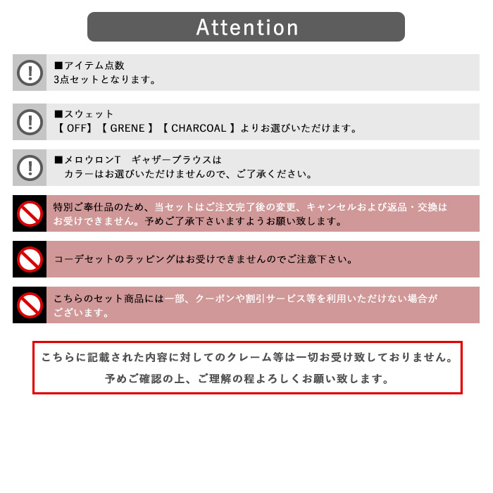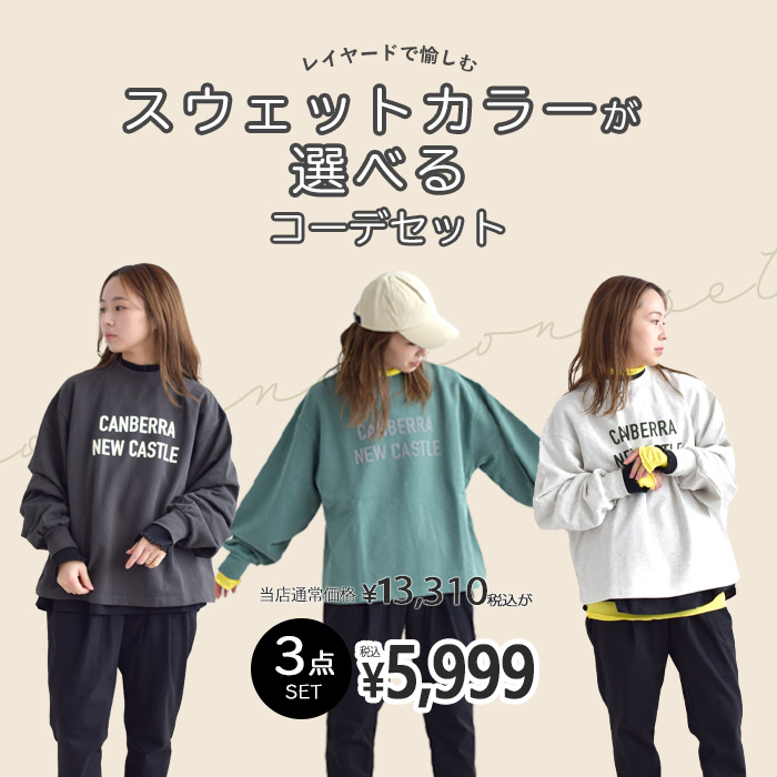 | 商品説明 | 安心×お得×使えるアイテムばかりを詰め込んだコーデセット スゥエット、メロウロンT、ギャザーブラウスの合計3点でこのお値段! オールシーズン使えるアイテムばかりなので、正直外れなしです! 重ね着をしてこなれ感のあるセット お手持ちのお洋服とあわせてあなたらしく |