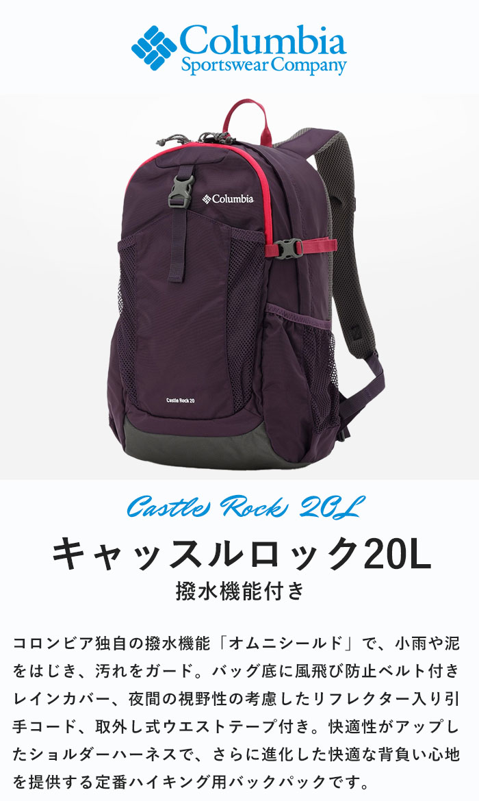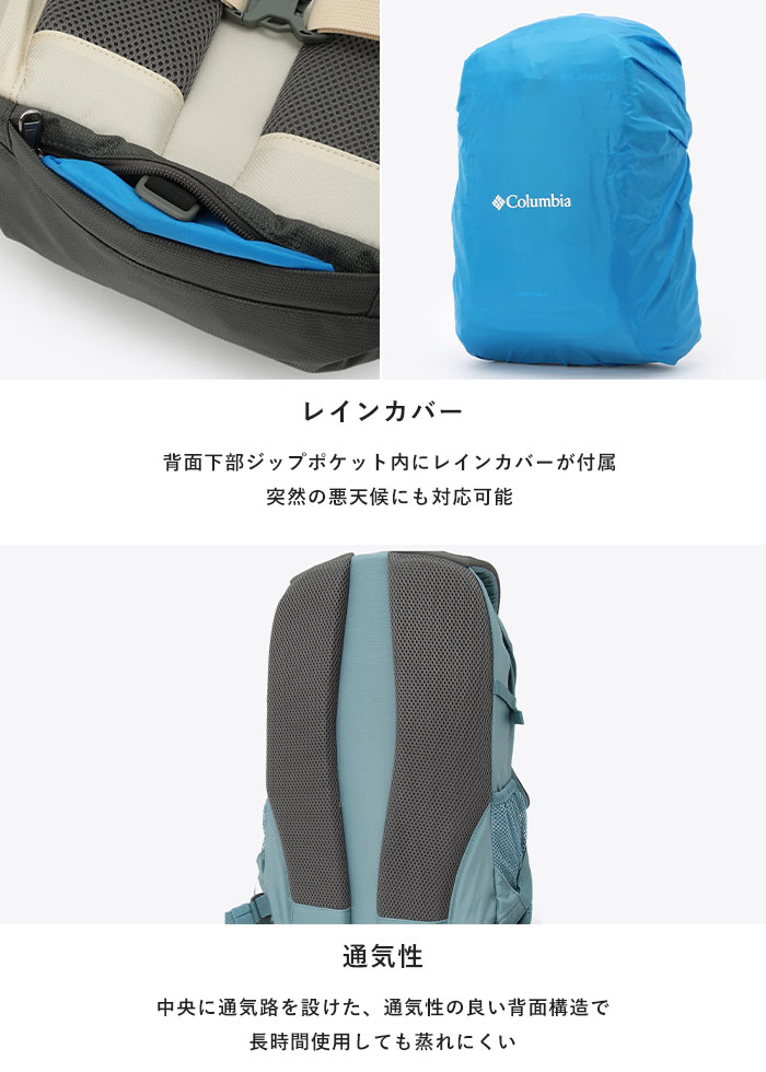 | 商品説明 | さらに進化した快適な背負い心地を提供する定番ハイキング用バックパック。 シンプルなデザインで使い勝手の良さを高めたハイキングバッグ。 中央に通気路を設けた背面構造で通気性アップ。 メインコンパートメント内部にオープンポケット、セカンドコンパートメント内部に、面ファスナー仕様のポケットとテープループを搭載。 風飛び防止ベルト付きレインカバーもついてます。 デイリーなタウンユースにも対応可能なルックスも魅力です。 ・コロンビア独自のはっ水(撥水)機能「オムニシールド」 |