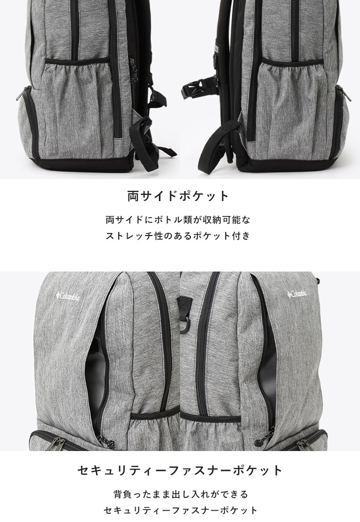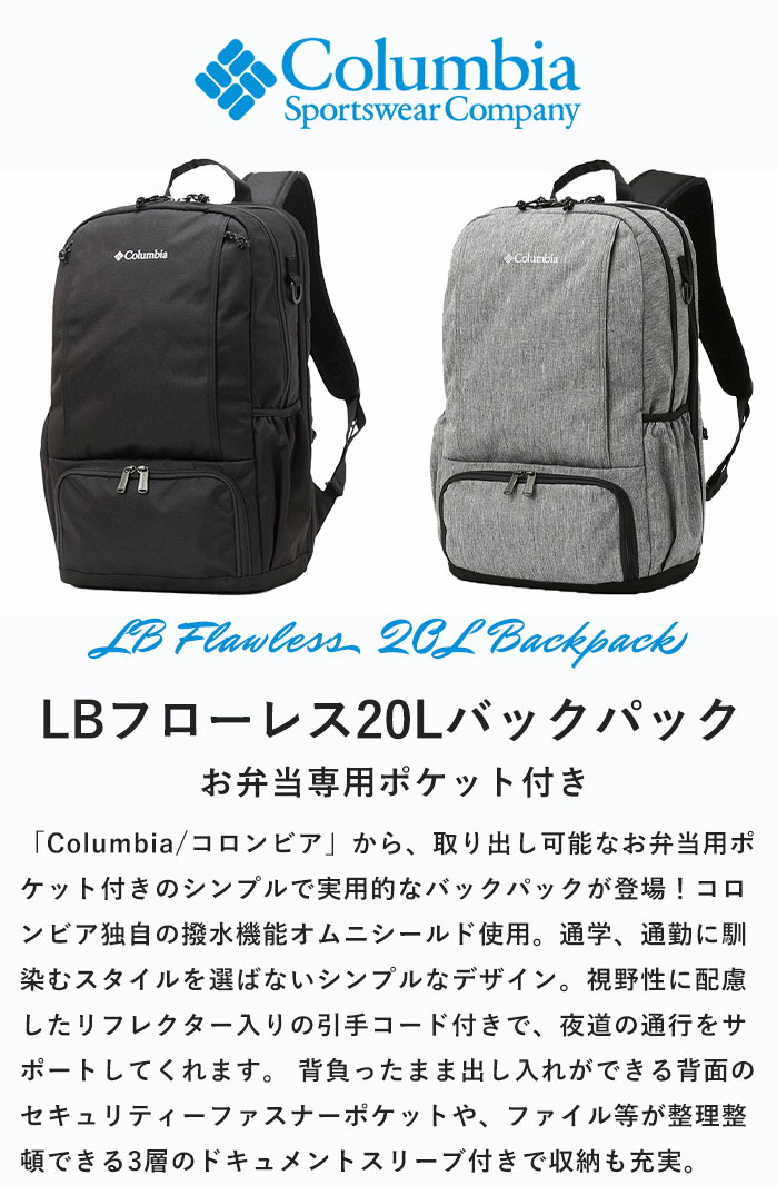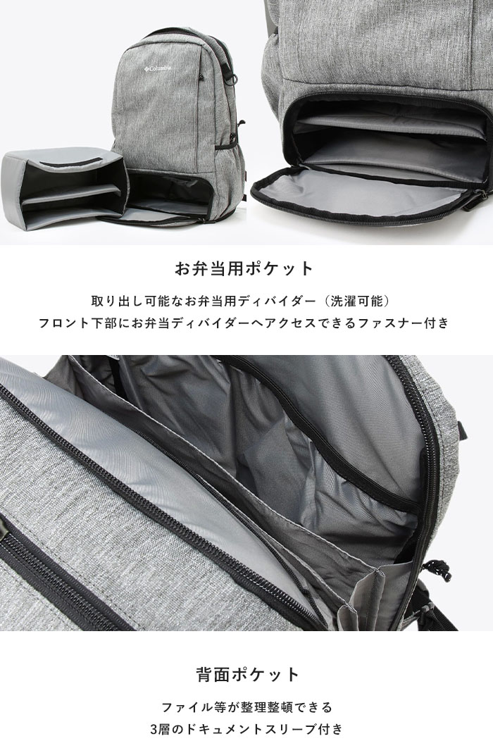 | 商品説明 | お弁当専用のコンパートメントを持ったシンプルで実用的なバックパック。 コロンビア独自のはっ水(撥水)機能「オムニシールド」。 スタイルを選ばないシンプルなデザイン。 メインコンパートメント内部に、小物類等が収納できるオーガナイザーポケット。 メインコンパートメント背面にファイル等が整理整頓できる3層のドキュメントスリーブ。 メインコンパートメント内部は、荷物に応じて可変できる2気質構造。 フロントポケット内部にペンホルダー。 取り出し可能なお弁当用ディバイダー※洗濯可能。 フロント下部にお弁当ディバイダーへアクセスできるファスナー。 背負ったまま出し入れができる、背面のセキュリティーファスナーポケット。 両サイドにボトル類が収納できるストレッチ性のあるポケット。 両サイドにDカン。 視野性に配慮したリフレクター入りの引手コード。 |