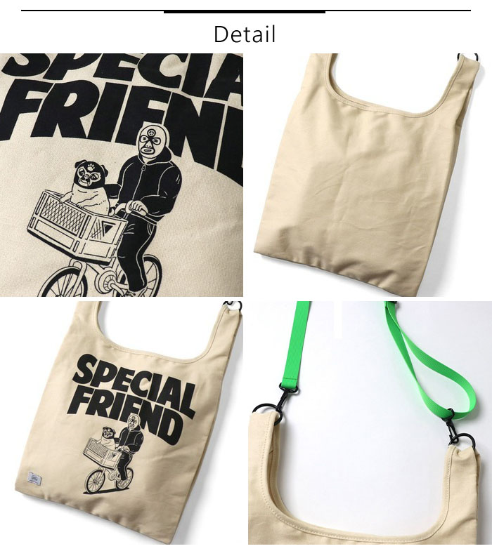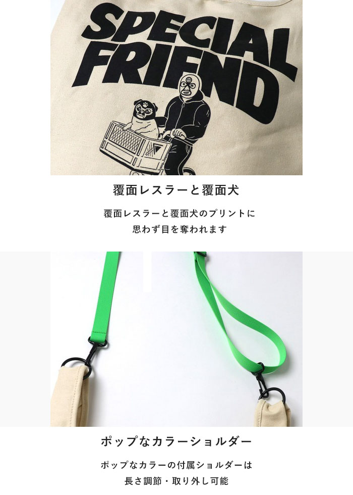 | 商品説明 | 覆面レスラーと覆面犬のプリントに思わず目を奪われます。 キャンバス素材をつかったトートバッグに、ポップなカラーの付属ショルダーを付ければ、ショルダーバッグに! A4サイズが入るサイズです。 |