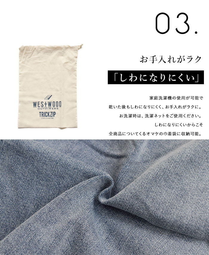 ONEWASHは濃色のデニムに見えて色落ちしにくい素材です。