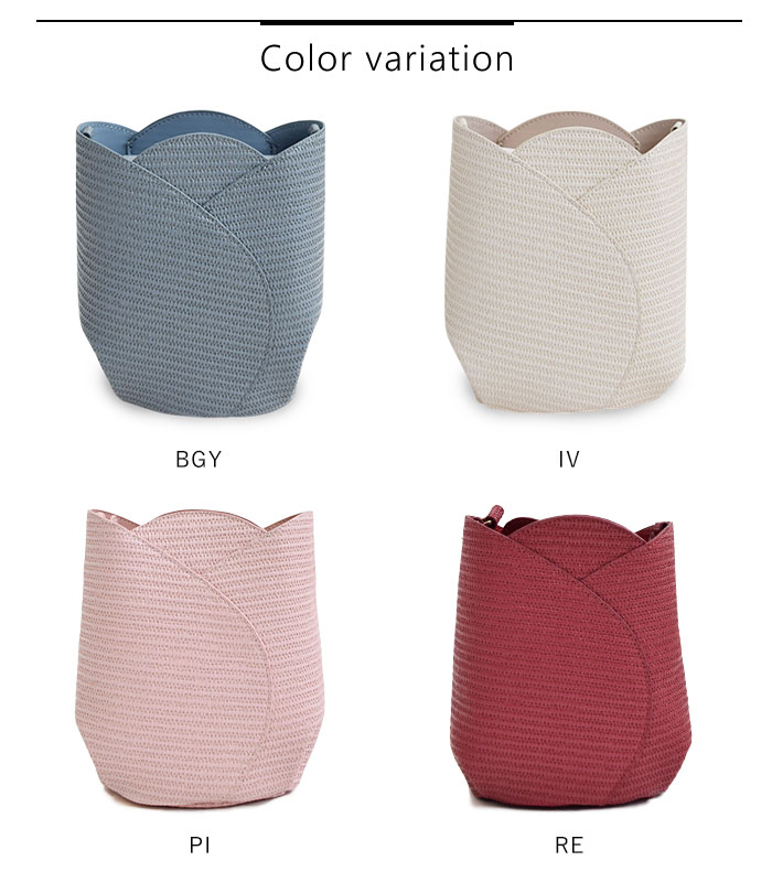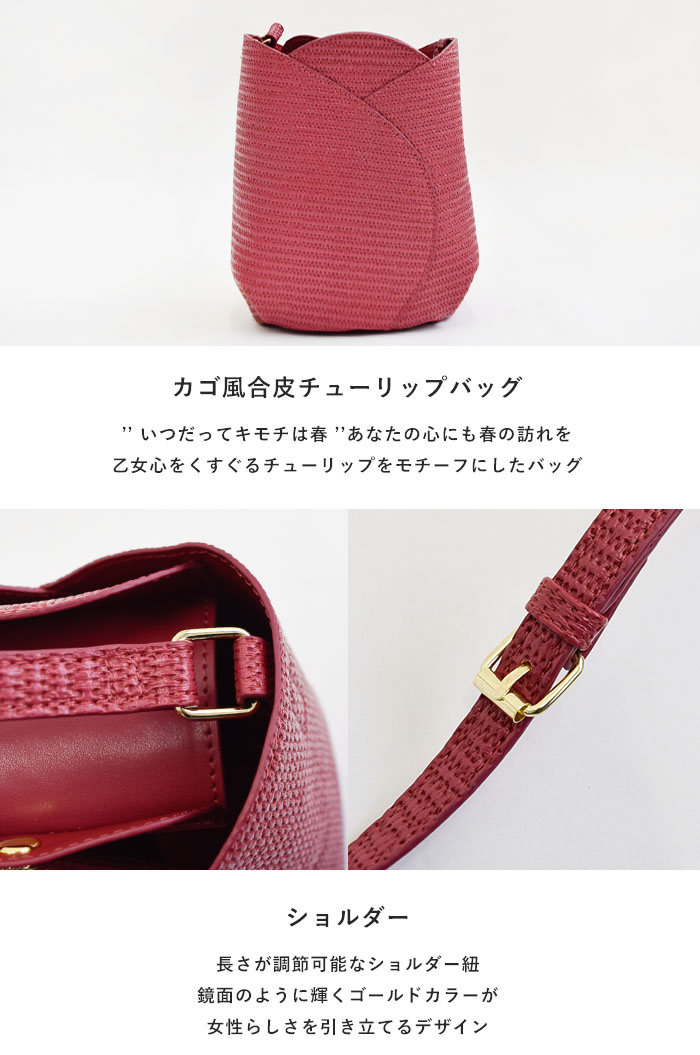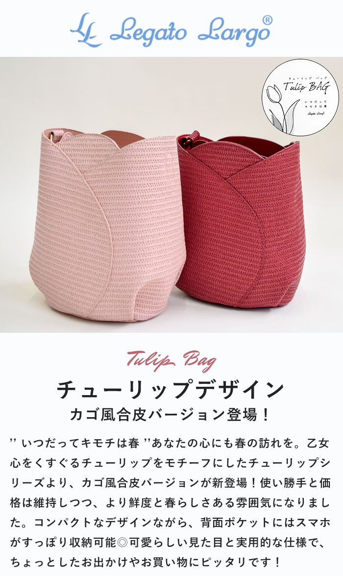 商品説明 チューリップバッグがカゴ風合皮バージョンで登場!より鮮度と春らしさある雰囲気になりました。可愛らしい見た目と実用的な仕様で、ちょっとしたお出かけやお買い物にピッタリです