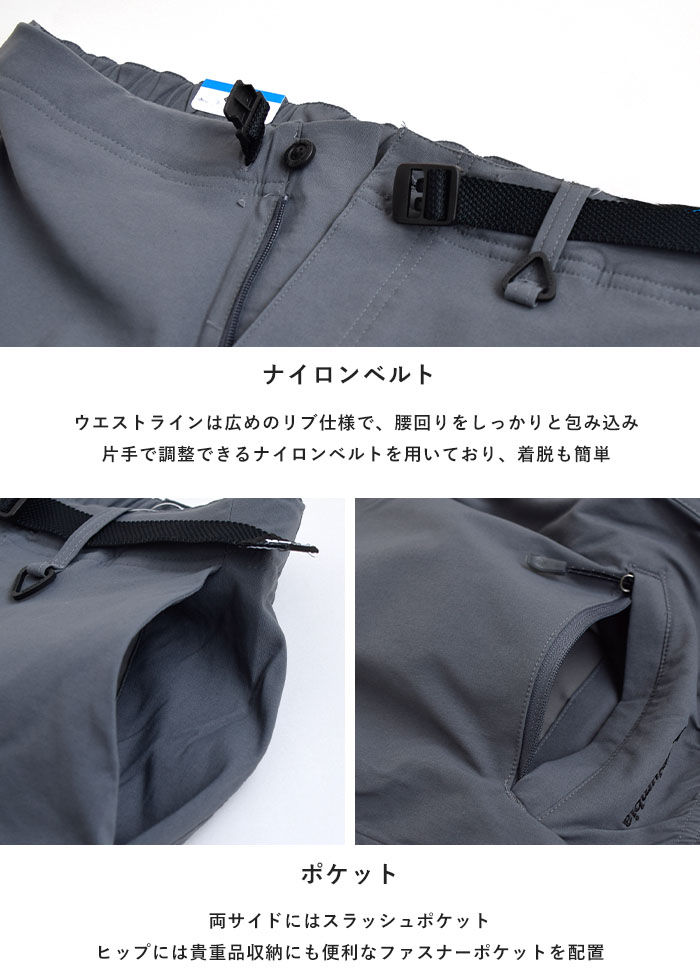 ウエストラインは広めのリブ仕様で、腰回りをしっかりと包み込み、片手で調整できるナイロンベルトを用いており、着脱も簡単です。