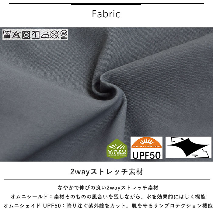 小雨程度の雨を弾く、はっ水(撥水)機能「オムニシールド」に加えて、紫外線から肌を守るサンプロテクション機能「オムニシェイド」を備えるなど、アウトドア仕様の機能性も充実しています。