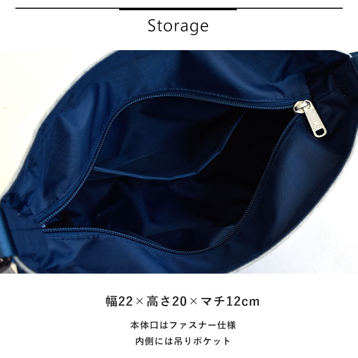 本体口はファスナー仕様。内側には吊りポケットがあり、散らばりがちな小物を分けて入れることができます。
