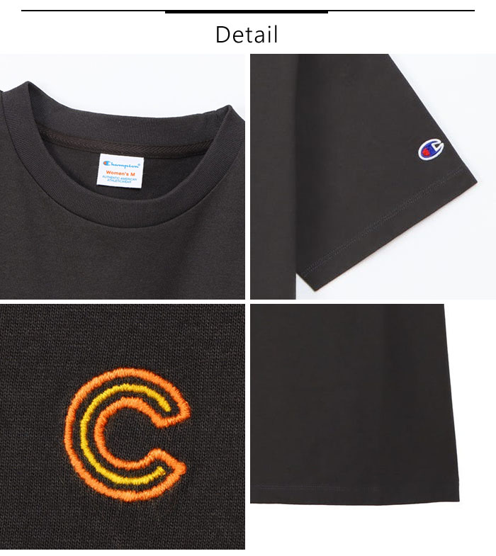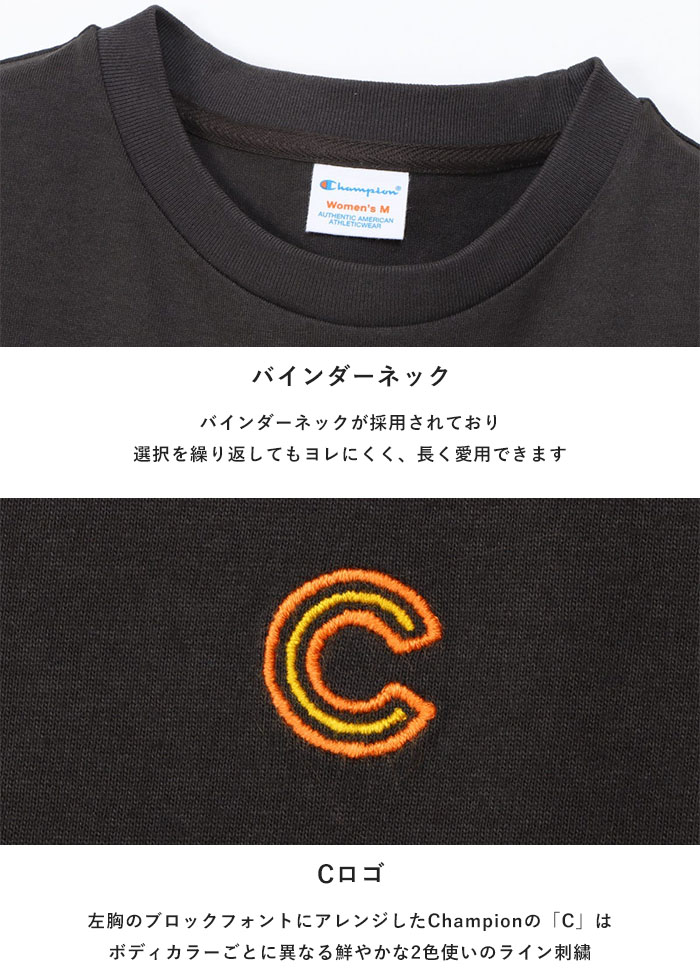 左胸のブロックフォントにアレンジしたChampion(チャンピオン)の「C」は、ボディカラーごとに異なる鮮やかな2色使いのライン刺繍です