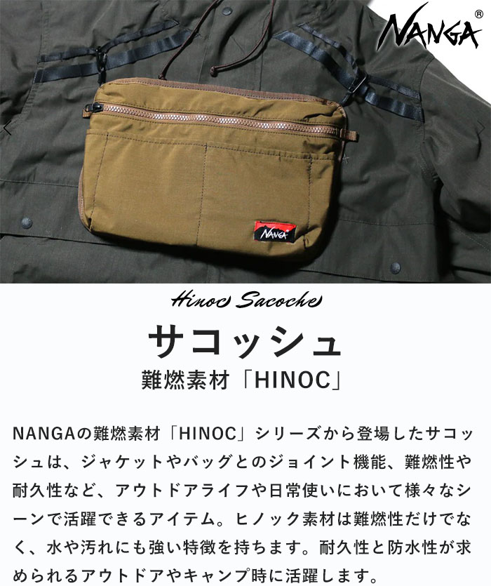 ヒノックシリーズでおなじみの難燃素材を採用したサコッシュ。カラビナを使ってヒノックアノラックパーカーにジョイントできる仕様になっております。 ジャケットやバッグに付けたり、単独で使ったりすることで、さまざまなシーンやスタイルに合わせて使えます。 シンプルなデザインでどんなスタイルでも使いやすいアイテム。スッキリとしたスリムなデザインですが、マチが付いているため2L以上カバーできる優れた収納力。 ヒノック素材は難燃性だけでなく、水や汚れにも強い特徴を持ちます。耐久性と防水性が求められるアウトドアやキャンプ時に活躍します。 このヒノックシリーズのサコッシュは、ジャケットやバッグとのジョイント機能、難燃性や耐久性など、アウトドアライフや日常使いにおいて様々なシーンで活躍できるアイテムです。 HINOC(ヒノック)生地・・・ | 素材 | 表地:ポリエステル93%、アラミド繊維混合7% 裏地:ポリエステル100% |