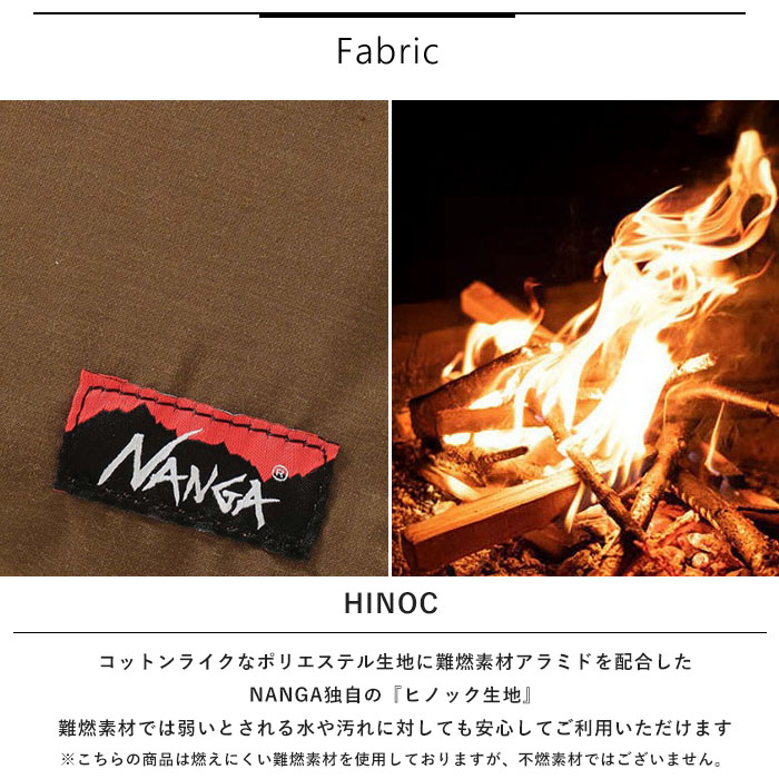 コットンライクなポリエステル生地に難燃素材アラミドを配合したNANGA独自の『ヒノック生地』。焚き火によって舞う火の粉に対して、燃えにくい難燃性が一番の特徴。ナンガ独自の混合は、難燃素材では弱いとされる水や汚れに対しても安心してご利用いただけます。また、柔らかくアラミド繊維特有のゴワゴワ感は一切ありません。