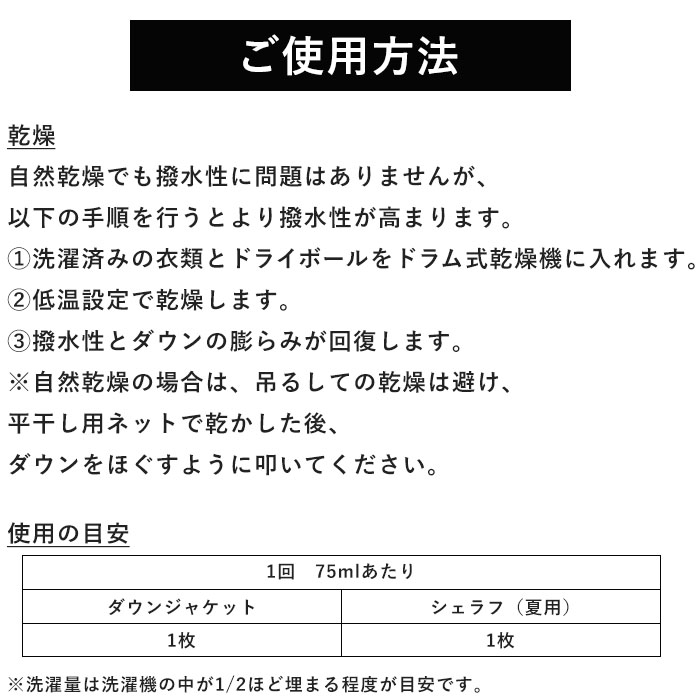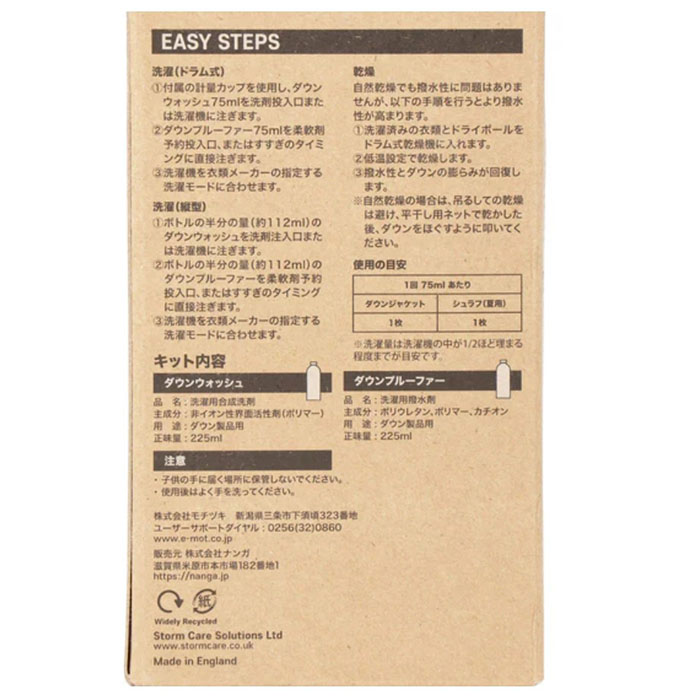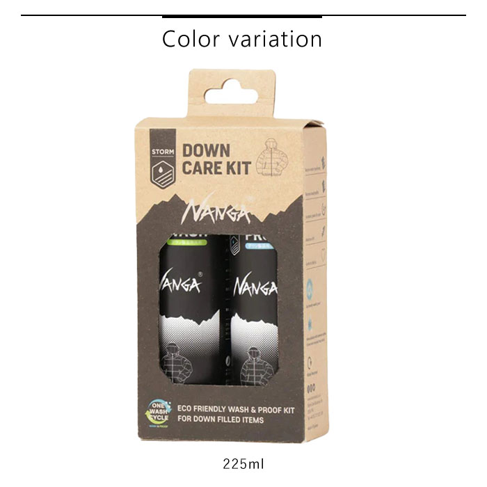 ダウン製品全般の洗濯、クリーニングに使える洗剤と撥水剤が、NANGA特注パッケージに。撥水剤と一度に入れて洗濯できるの大きな特徴。汚れを落としながら、ウェア本来の機能を回復させ、長持ちさせます。