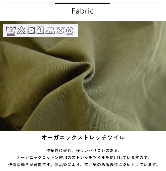 細身シルエットですが、伸縮性に優れ、程よいハリコシのある、オーガニックコットン使用のストレッチツイルを使用していますので、快適な動きが可能です。