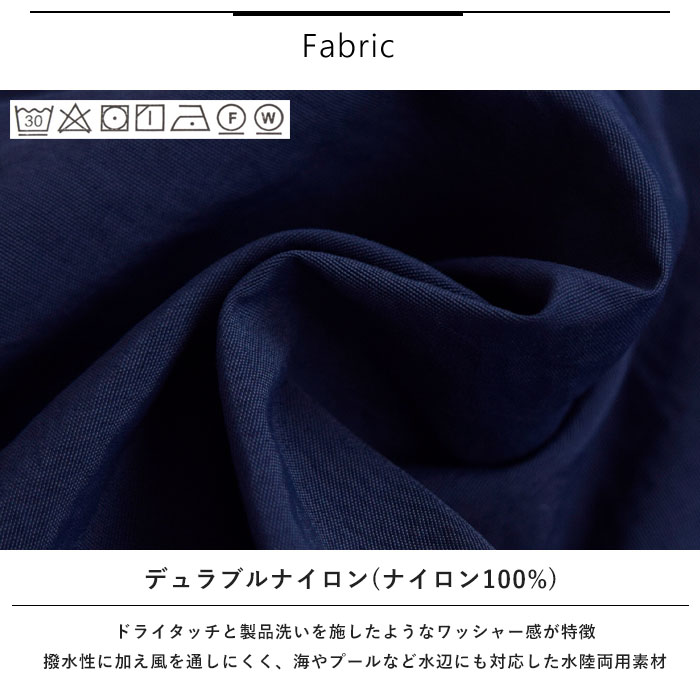ドライタッチと製品洗いを施したようなワッシャー感が特徴で、撥水性に加え風を通しにくく、海やプールなど水辺にも対応した水陸両用素材ですので、様々なシーンで活躍します。