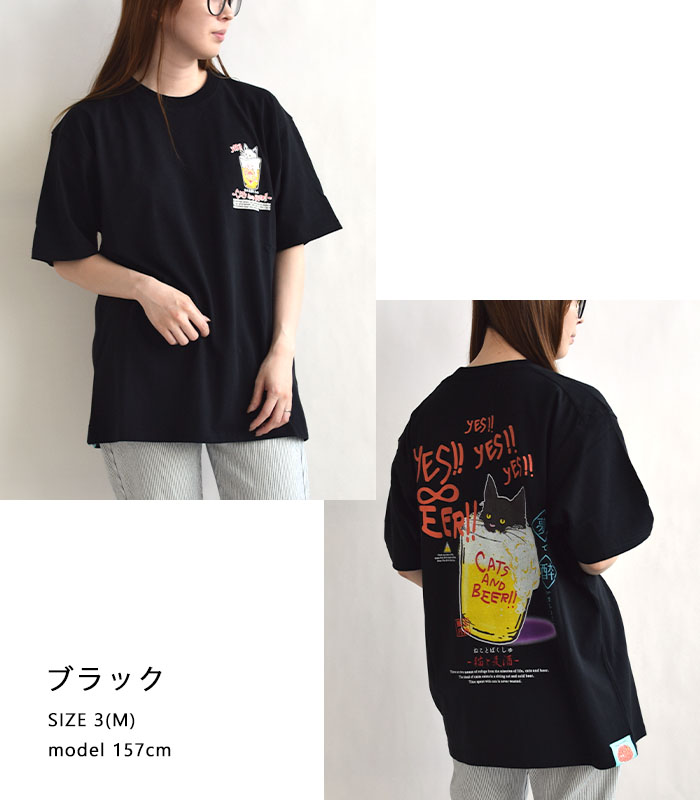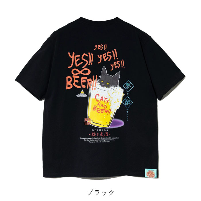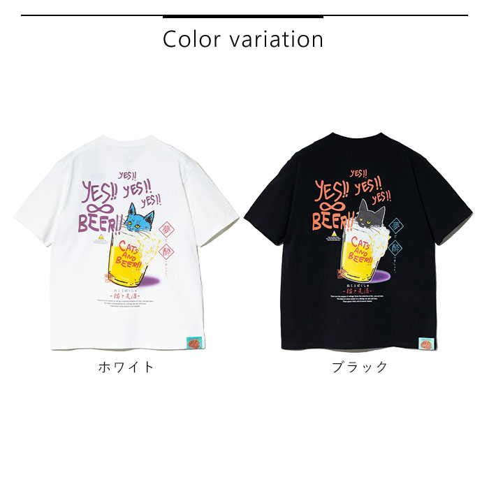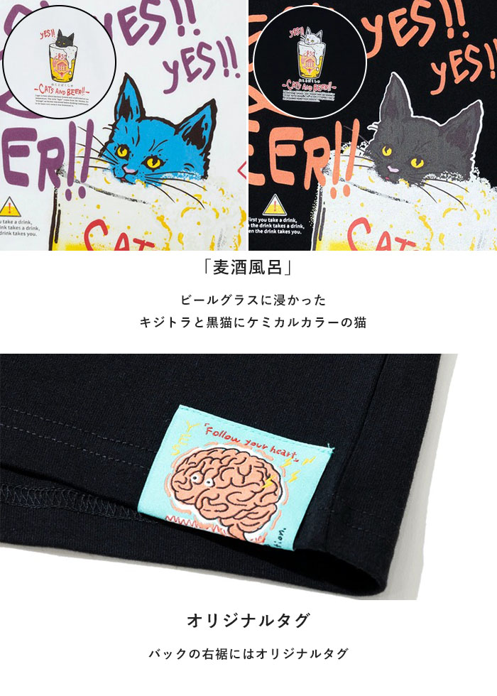 生地馴染みのいいプリント手法でカラフルにバックプリント。ビールグラスに浸かったキジトラと黒猫にケミカルカラーの猫。フロントにはワンポイントプリント。