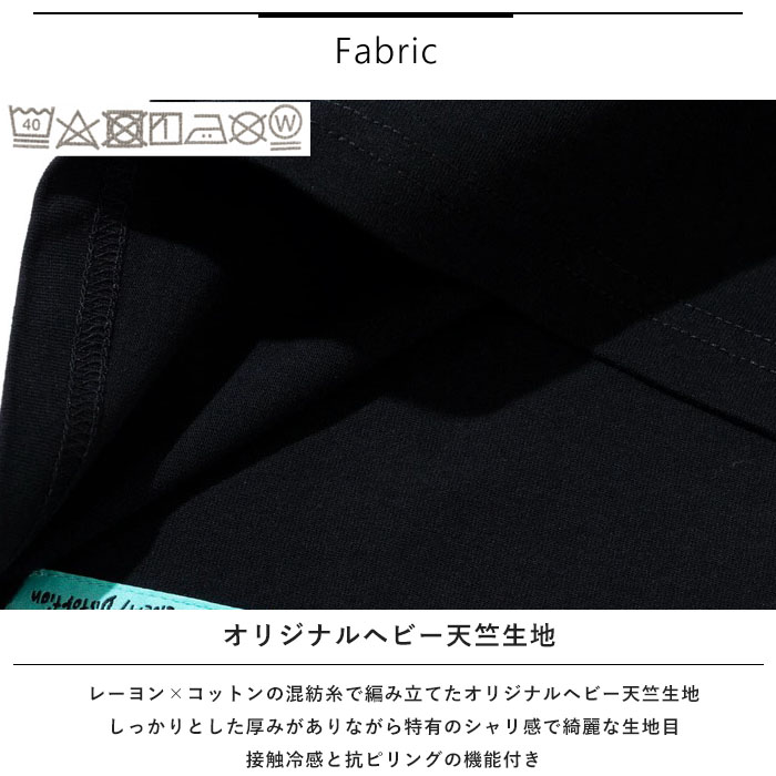 商品説明 レーヨン×コットンの混紡糸で編み立てたオリジナルヘビー天竺生地。しっかりとした厚みがありながら特有のシャリ感で綺麗な生地目です。接触冷感と抗ピリングの機能性もあり、ヘビーでも涼し気に着れるおススメ素材。