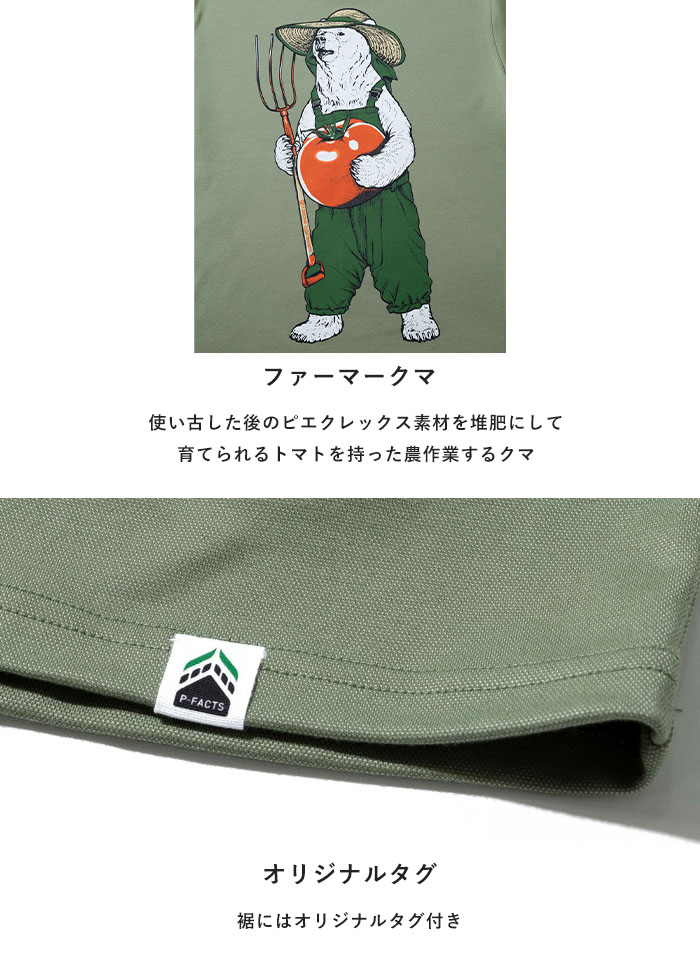 | 商品説明 | 『でんき(電気)のせんい(繊維)で世界を変える』 着るだけでテクノロジー体感ができ、地球にもやさしい素材「ピエクレックス」のクマTEE。デザインには使い古した後のピエクレックス素材を堆肥にして育てられるトマトを持った農作業するクマをプリント。繊維が動くことで発生する微弱な電気の力で抗菌効果※1 を発揮する素材なので、実際の農作業などの汗をかくシーンでも活躍。ボロボロになったら土に還して循環するアイテム。 《ピエクレックスの特徴》 また、ピエクレックスの原料であるポリ乳酸は、トウモロコシやサトウキビといった植物由来のバイオプラスチックで、生分解性※2 があるため環境への負荷が少ないのが特徴です。適切な堆肥化処理を行うことで、石油由来のポリエステル繊維(PET繊維)と比較してCO2排出量を約41%削減※3 できます。 さらに、ピエクレックス繊維を使用したアパレル製品や繊維製品は、使い古した後、「P-FACTS」(ピーファクツ)という回収・堆肥 化システムによって自然に還り、次の植物の栽培に再利用されます。日常生活の中でピエクレックス製品を使用することで、最先端のテクノロジー体感と環境保全を同時に実現することが可能です。 ※1 抗菌効果とは、菌の増殖を抑える効果のことです。使用状況により効果は変わります。 |