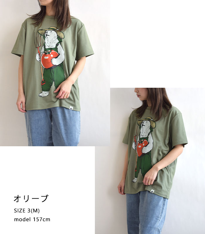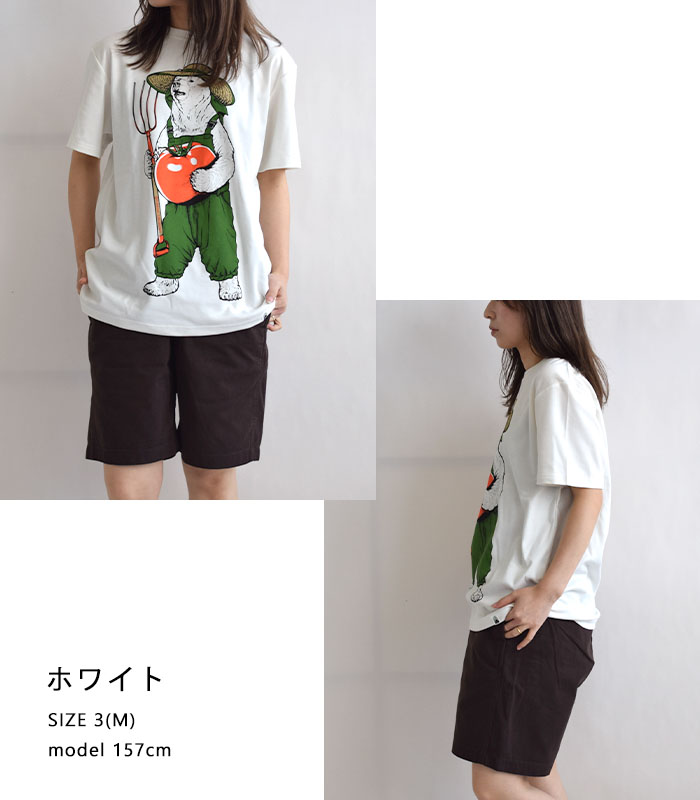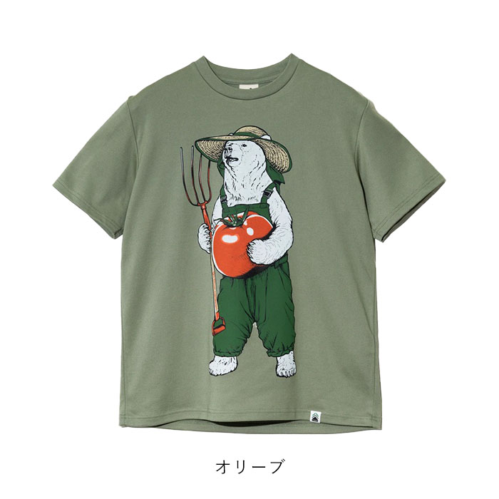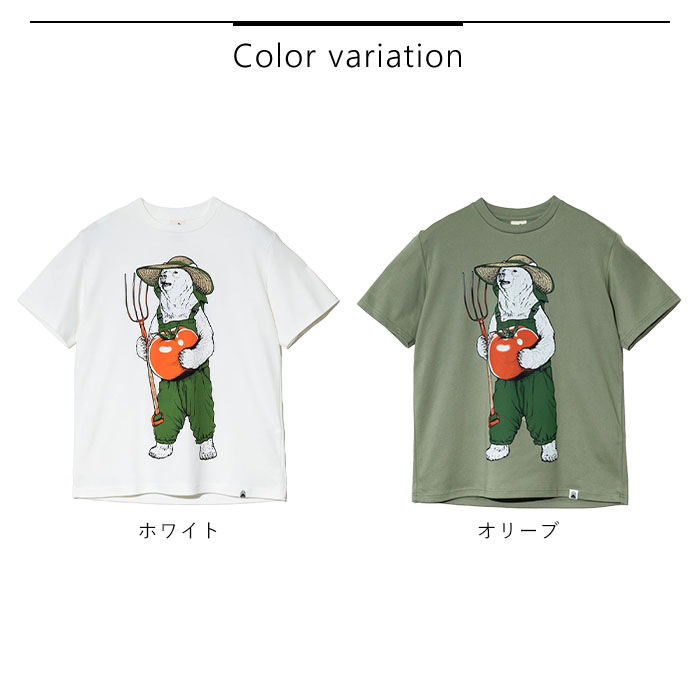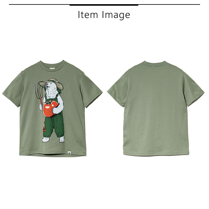 着るだけでテクノロジー体感ができ、地球にもやさしい素材「ピエクレックス」のクマTEE。デザインには使い古した後のピエクレックス素材を堆肥にして育てられるトマトを持った農作業するクマをプリント。繊維が動くことで発生する微弱な電気の力で抗菌効果※1 を発揮する素材なので、実際の農作業などの汗をかくシーンでも活躍。ボロボロになったら土に還して循環するアイテム。