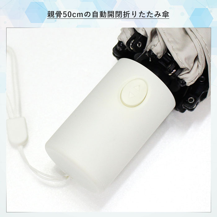 | 商品説明 | ハンドル部分のボタンを押すだけで自動で開閉してくれる親骨50cmのコンパクトで便利な自動開閉折りたたみ傘です。たたんだ時は高さ約23cm、重量約210g(本体)と従来の自動開閉の「長い、重い」を解消しました。コンパクトでも6本骨構造なので開くと大きく、十分に日差しや雨を防ぎます。紫外線遮蔽率100%、UPF50+、遮光率100%、遮熱性効果で強い日差しや暑さをしっかり遮ります。雨の日にも安心なはっ水・防水効果もあり、耐水圧の検査も18,000mm以上を計測していますので、晴雨兼用日傘としてオールシーズンお使いいただけます。傘骨は特殊な構造により手を離した位置でシャフトの伸縮が止まり、少しづつ段階的に収納できるので安全にお使いいただけます。ケースの脇にファスナーがついているので収納しやすく、持ち運びに便利です。※記載の紫外線遮蔽(UVカット)率・UPF値・遮光率・耐水圧値は生地の状態での測定値であり、傘本体の性能を保証する数値ではございません。また、生地に施された縫製などのUV加工生地以外の部分も同様です。