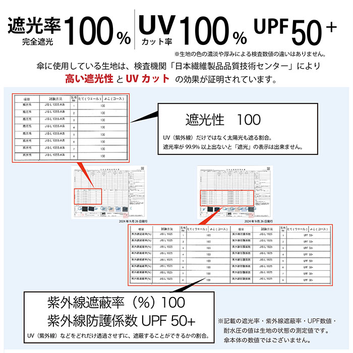 | 詳細 | ・親骨の本数:6本 ・親骨の素材:グラスファイバー/アルミ ・中棒の素材:アルミ/鉄 ・手元の素材:ABS樹脂 ・遮光率 100% ・紫外線遮蔽率 100% |
