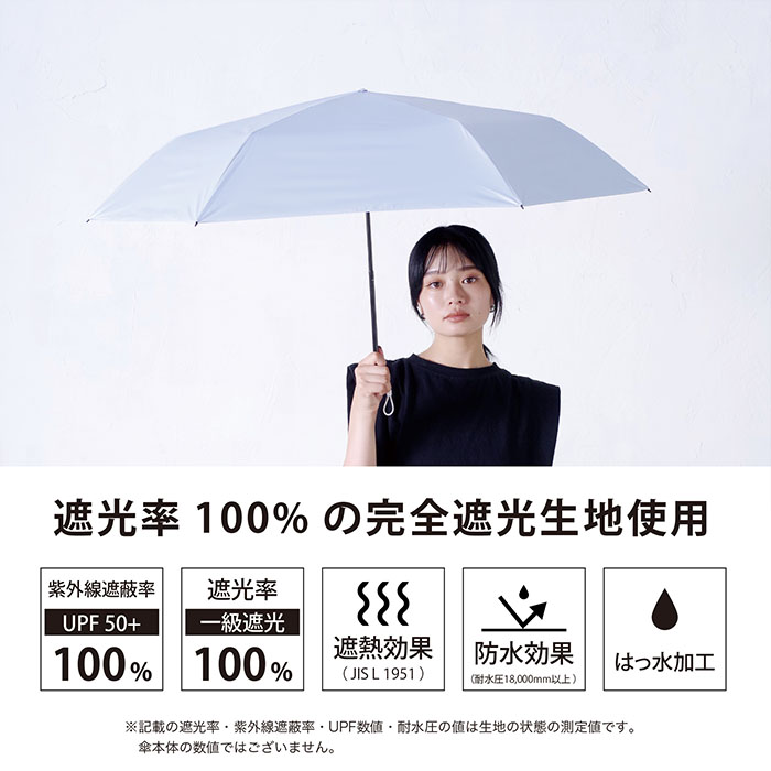 ハンドル部分のボタンを押すだけで自動で開閉してくれる親骨50cmのコンパクトで便利な自動開閉折りたたみ傘です。たたんだ時は高さ約23cm、重量約210g(本体)と従来の自動開閉の「長い、重い」を解消しました。コンパクトでも6本骨構造なので開くと大きく、十分に日差しや雨を防ぎます。紫外線遮蔽率100%、UPF50+、遮光率100%、遮熱性効果で強い日差しや暑さをしっかり遮ります。雨の日にも安心なはっ水・防水効果もあり、耐水圧の検査も18,000mm以上を計測していますので、晴雨兼用日傘としてオールシーズンお使いいただけます。傘骨は特殊な構造により手を離した位置でシャフトの伸縮が止まり、少しづつ段階的に収納できるので安全にお使いいただけます。ケースの脇にファスナーがついているので収納しやすく、持ち運びに便利です。※記載の紫外線遮蔽(UVカット)率・UPF値・遮光率・耐水圧値は生地の状態での測定値であり、傘本体の性能を保証する数値ではございません。また、生地に施された縫製などのUV加工生地以外の部分も同様です。