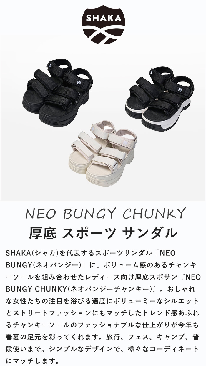 SHAKA(シャカ)を代表するスポーツサンダル「NEO BUNGY(ネオバンジー)」に、ボリューム感のあるチャンキーソールを組み合わせたレディース向け厚底スポサン『NEO BUNGY CHUNKY(ネオバンジーチャンキー)』。