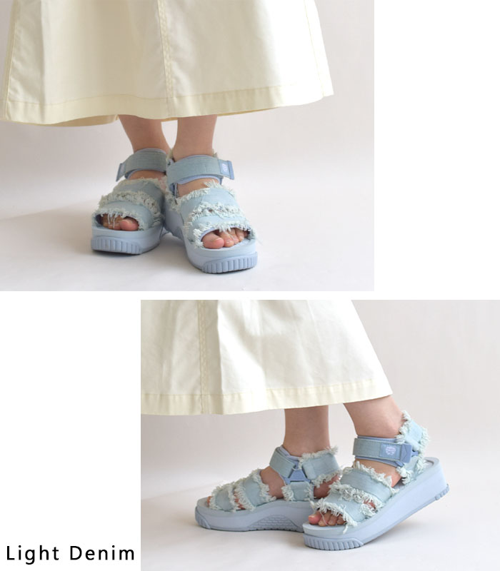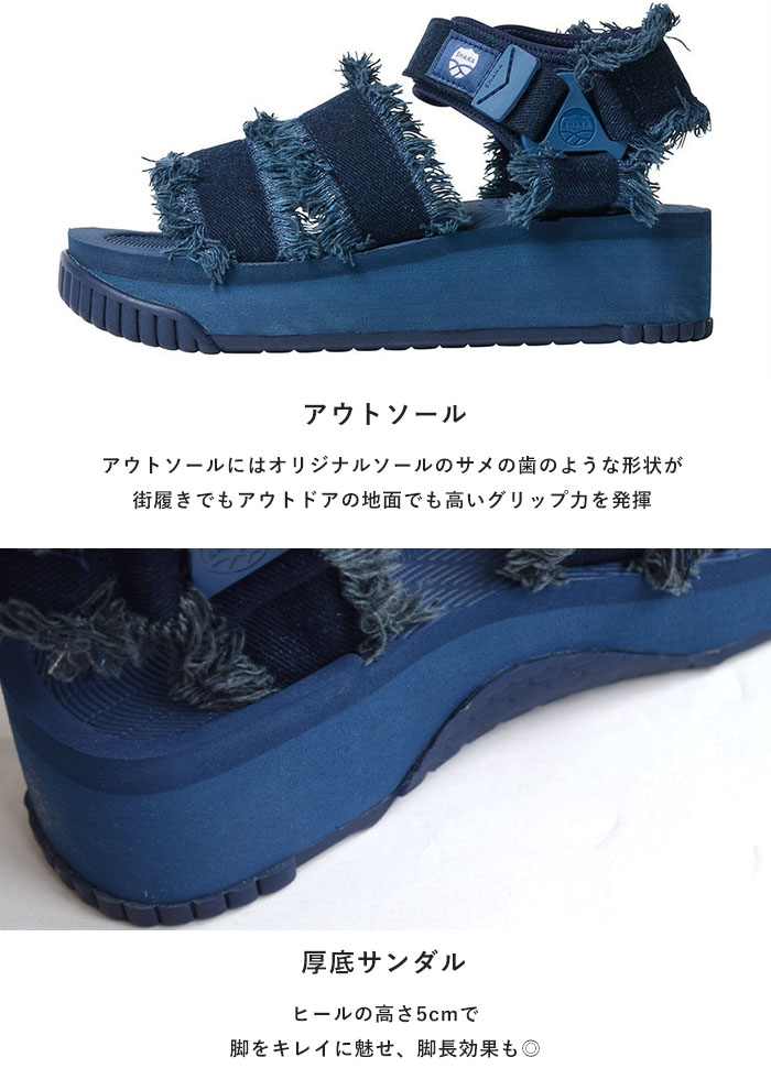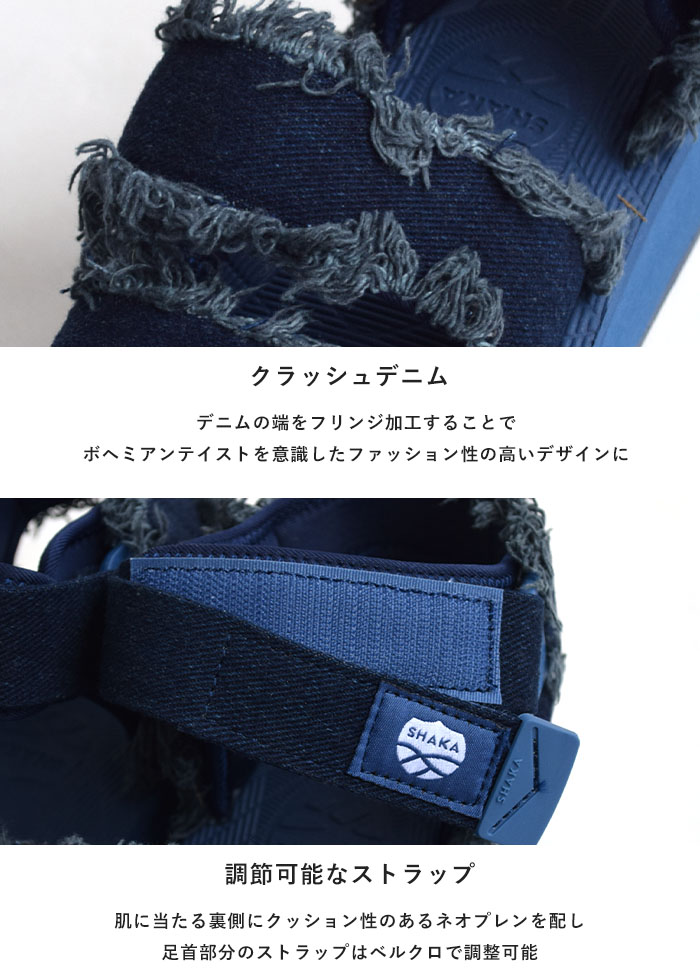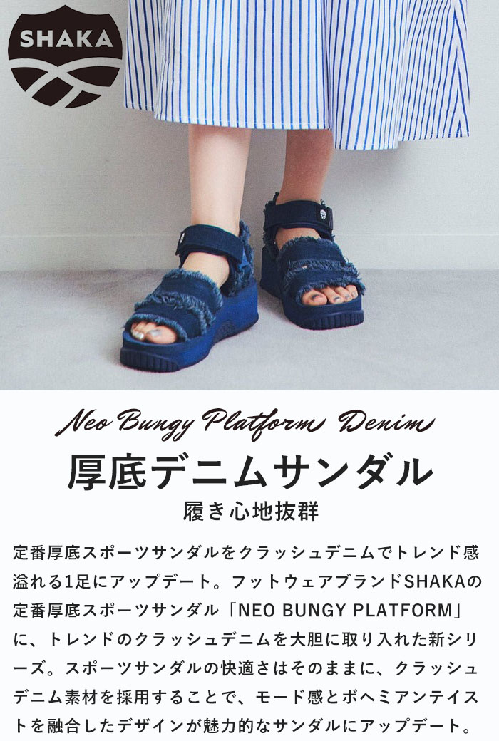 商品説明 フットウェアブランドSHAKA(シャカ)の定番厚底スポーツサンダル「NEO BUNGY PLATFORM」に、トレンドのクラッシュデニムを大胆に取り入れた新シリーズ『NEO BUNGY PLATFORM DENIM (ネオバンジープラットフォームデニム)』が登場しました。