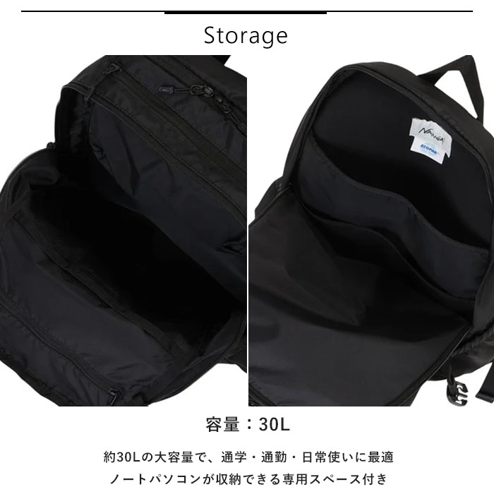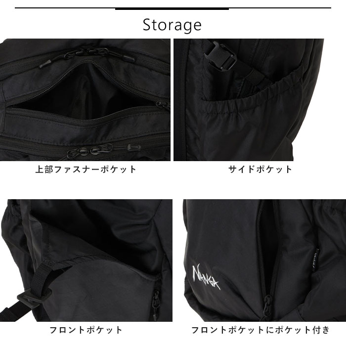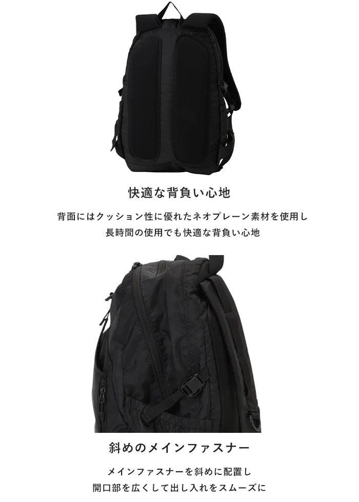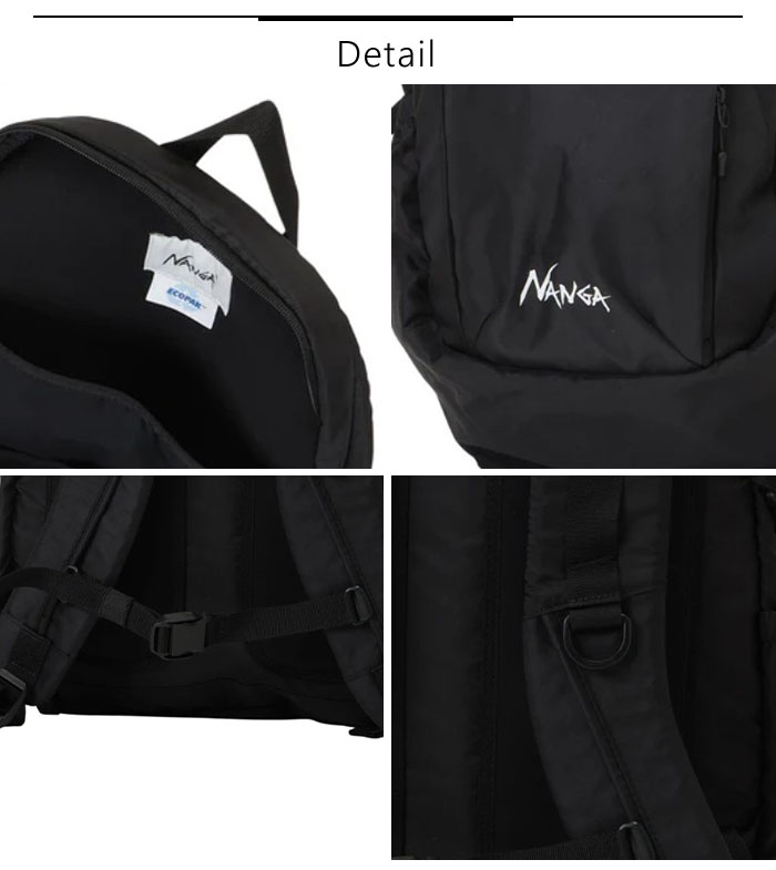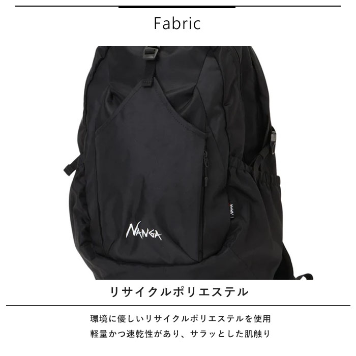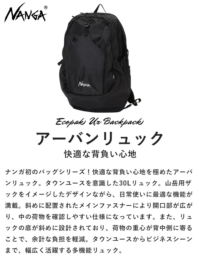 商品説明 NANGA初となるバッグシリーズECOPAKシリーズ。その中でも、特にタウンユースを意識した30Lリュックが登場。山岳用ザックをイメージしたデザインながら、日常使いに最適な機能が満載。斜めに配置されたメインファスナーにより開口部が広がり、中の荷物を確認しやすい仕様になっています。また、リュックの底が斜めに設計されており、荷物の重心が背中側に寄ることで、余計な負担を軽減。