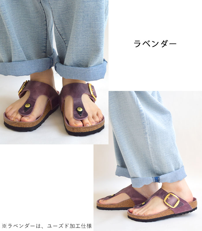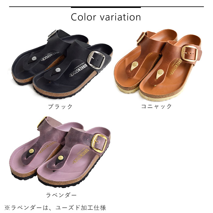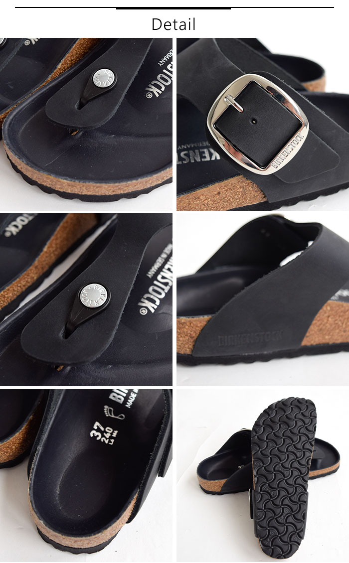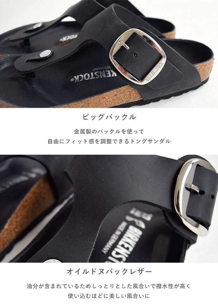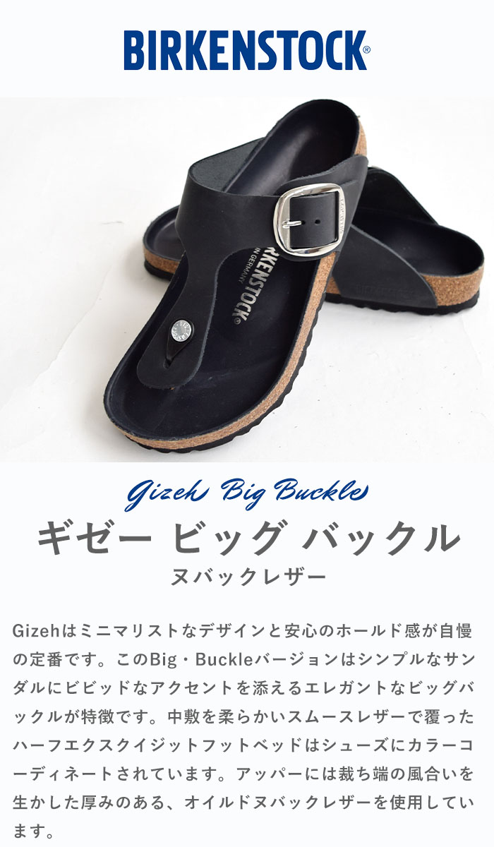 ビルケンシュトック Gizeh/ギゼはミニマリストなデザインと安心のホールド感が自慢の定番です。このBig・Buckleバージョンはシンプルなサンダルにビビッドなアクセントを添えるエレガントなビッグバックルが特徴です。中敷を柔らかいスムースレザーで覆ったハーフエクスクイジットフットベッドはシューズにカラーコーディネートされています。アッパーには裁ち端の風合いを生かした厚みのある、オイルドヌバックレザーを使用しています。