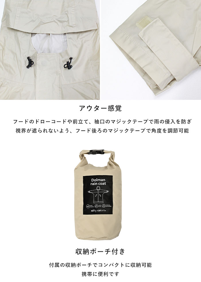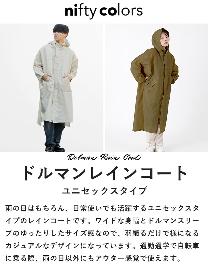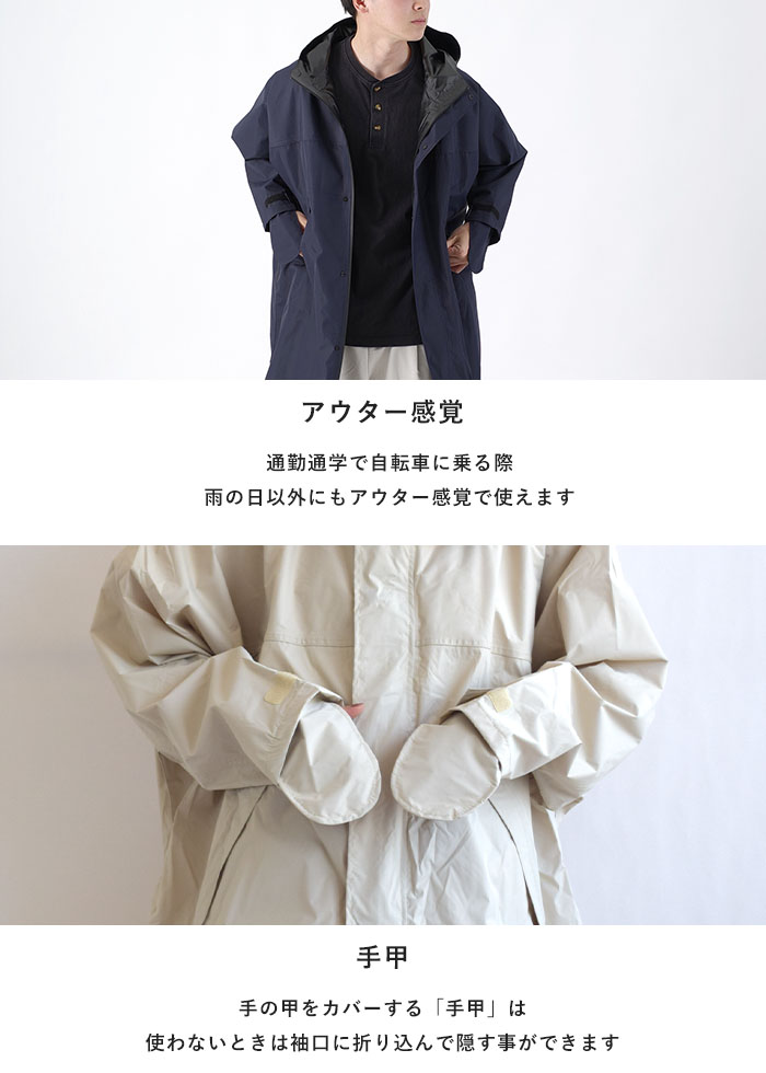 商品説明 雨の日はもちろん、日常使いでも活躍するユニセックスタイプのレインコートです。
