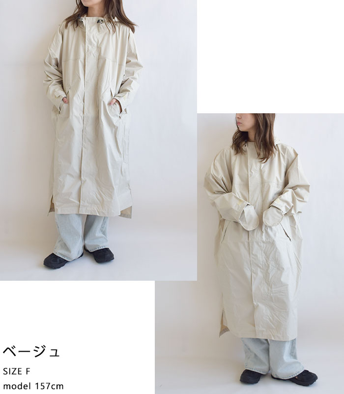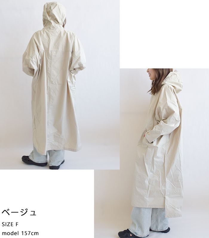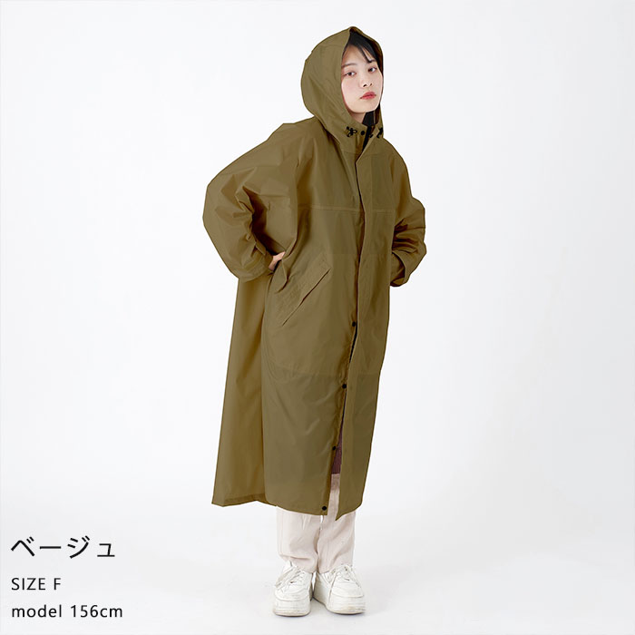 落ち着いた色味とユニセックスなシンプルなデザインが、着る人を選ばないカジュアルなレインコートです。適度なビッグシルエットのサイズ感なので、中に着る物を選ばない万能な一着です。
