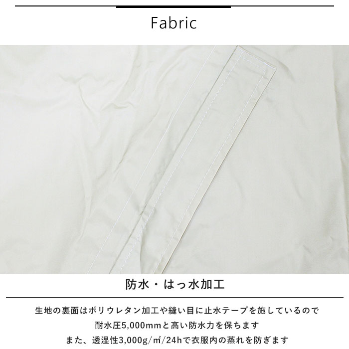 生地の裏面はポリウレタン加工や縫い目に止水テープを施しているので耐水圧5000mmと高い防水力を保ちます。
