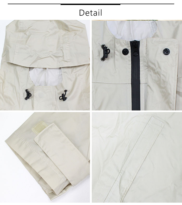 フードのドローコードや前立て、袖口のマジックテープで雨の侵入を防ぎます。