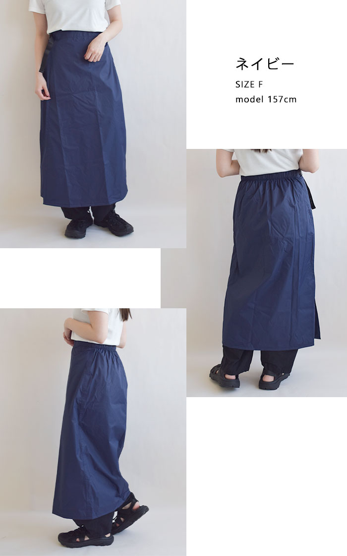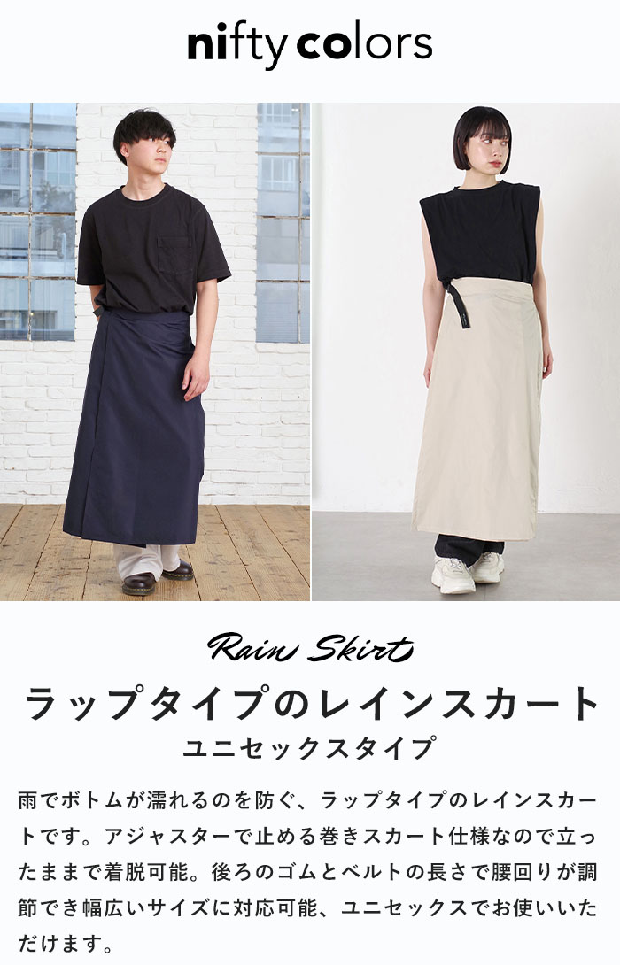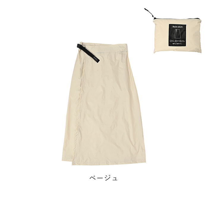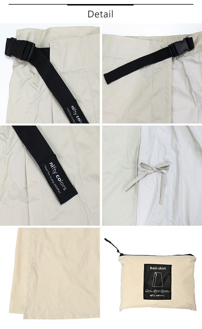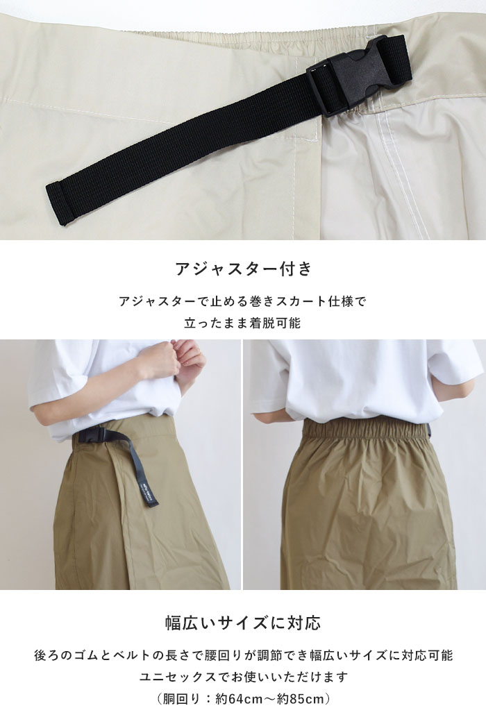 商品説明 雨でボトムが濡れるのを防ぐ、ラップタイプのレインスカートです。アジャスターで止める巻きスカート仕様なので立ったままで着脱可能。後ろのゴムとベルトの長さで腰回りが調節でき幅広いサイズに対応可能、ユニセックスでお使いいただけます。生地の裏面はポリウレタン加工や縫い目に止水テープを施しているので耐水圧5000mmと高い防水力を保ちます。裾がはだけないよう、内側に結べる紐が付いています。付属のファスナーケースにコンパクトに収納可能、携帯に便利です。(本製品は防水・はっ水加工しておりますが、完全防水ではございません。)