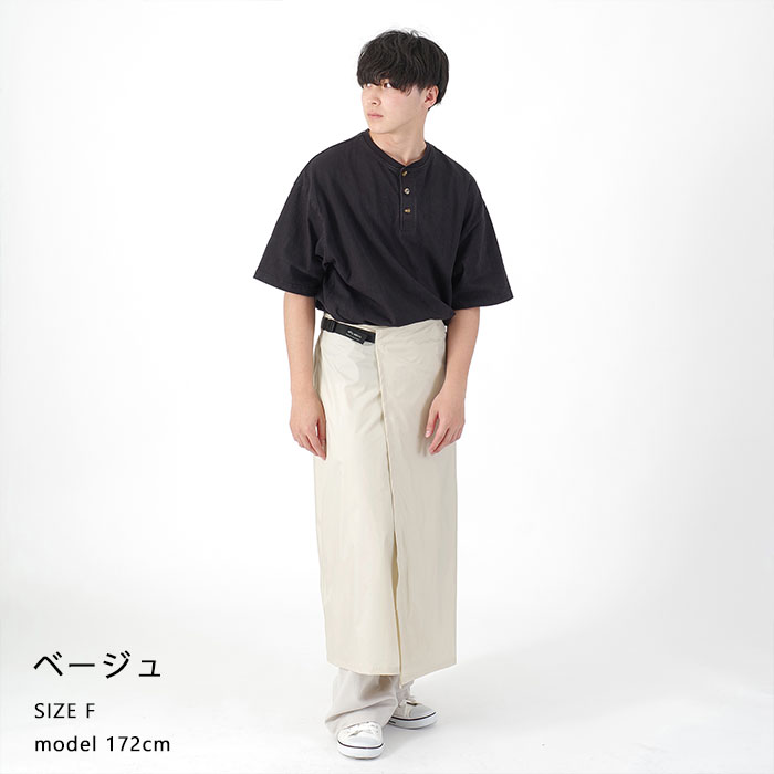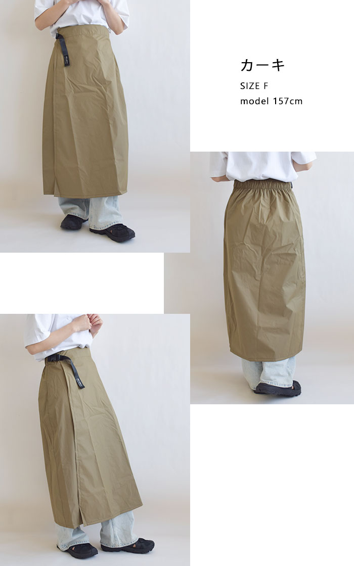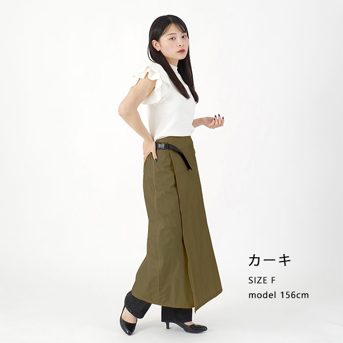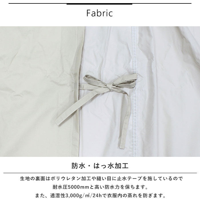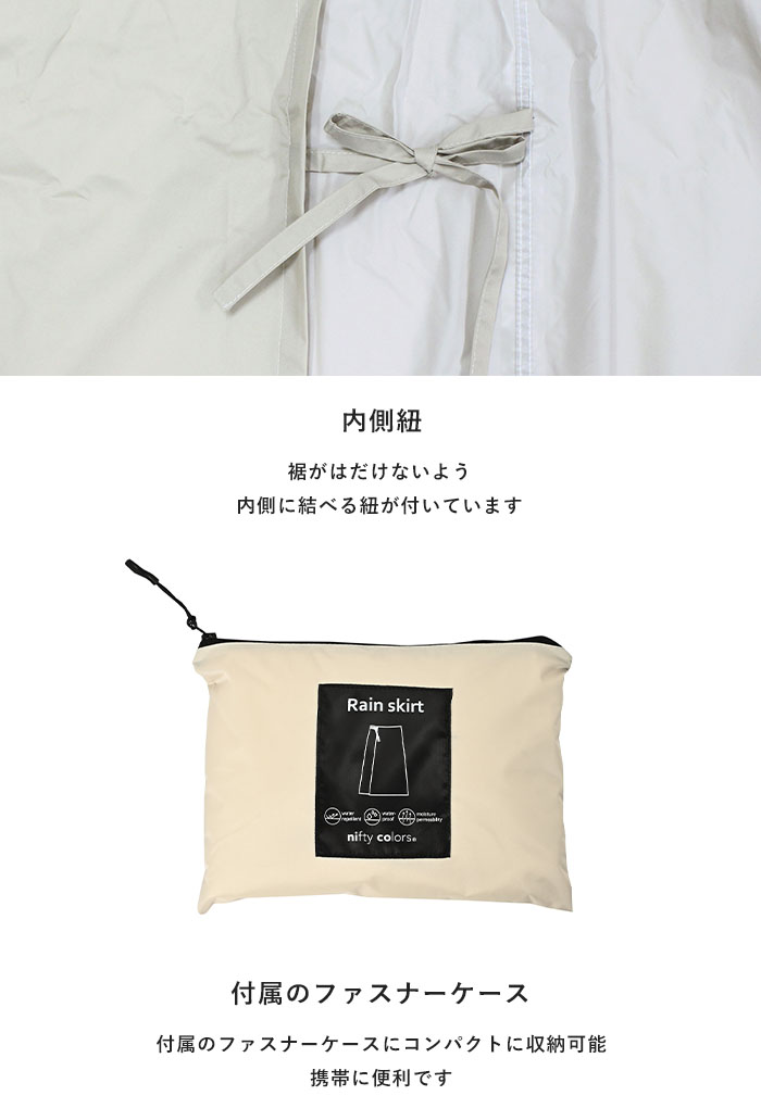 商品説明 雨でボトムが濡れるのを防ぐ、ラップタイプのレインスカートです。アジャスターで止める巻きスカート仕様なので立ったままで着脱可能。後ろのゴムとベルトの長さで腰回りが調節でき幅広いサイズに対応可能、ユニセックスでお使いいただけます。生地の裏面はポリウレタン加工や縫い目に止水テープを施しているので耐水圧5000mmと高い防水力を保ちます。裾がはだけないよう、内側に結べる紐が付いています。付属のファスナーケースにコンパクトに収納可能、携帯に便利です。(本製品は防水・はっ水加工しておりますが、完全防水ではございません。)