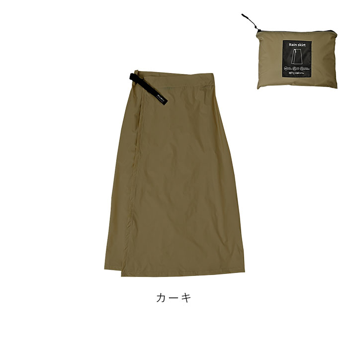 落ち着いた色味とシンプルなデザインが、着る人を選ばないカジュアルなレインスカートです。巻きスカートタイプなので足捌きがよく、ボトムスが隠れる程よい丈感で雨水などからの汚れを防ぎます。