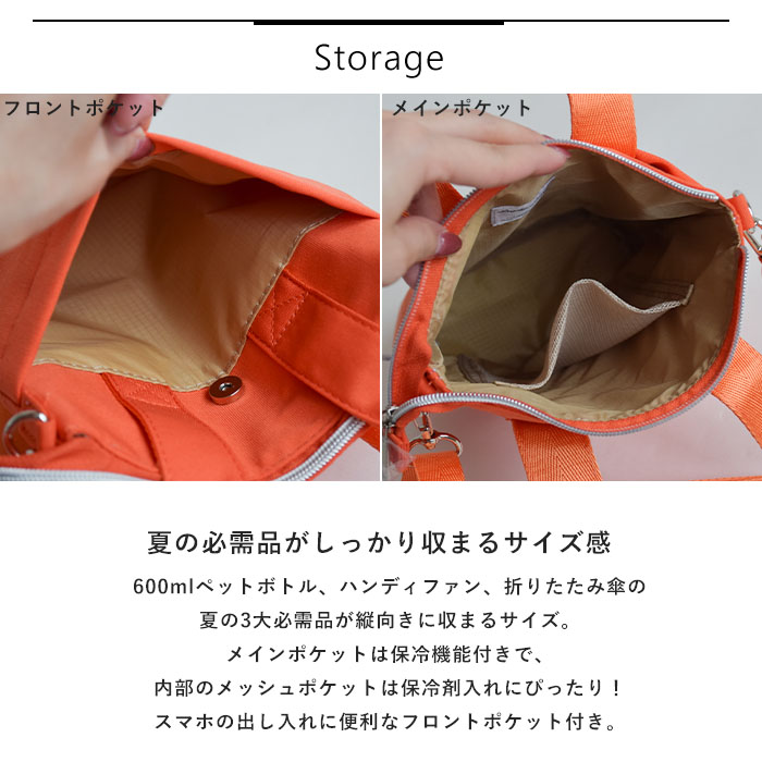 両面撥水&本体には保冷機能付きのバッグシリーズ。もっと遠くへ!もっと快適なおさんぽへ!600mlペットボトル、ハンディファン、折りたたみ傘、夏の3大必需品が縦向きに収まるバッグ。荷物はスッキリ持ちたい派の方におすすめです。