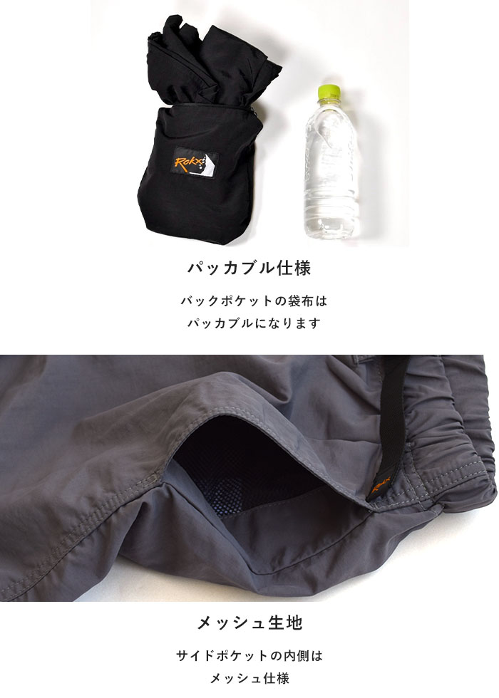| 商品説明 | ・耐久撥水(DWR)加工の施されたナイロン素材を使用したパッカブル仕様のショートパンツ ・さらっとした肌触りでややゆったりシルエット、コットンライクなルック ・夏シーズンのアクテビティ、海・川・湖などのレジャーに最適。 速乾、軽量が特徴のROKX ドライシリーズのショートパンツ。 軽量で丈夫なナイロン素材はサラッとした肌触りで撥水性もあり、高い速乾性を発揮。 バックポケットの袋布はパッカブルになります。 |