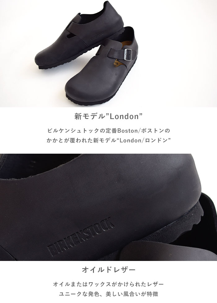 ビルケンシュトックの定番Boston/ボストンの、かかとが覆われた新モデルLondonの登場です。かかと部分が少し引き上げられたデザインのLondonには上質なオイルドヌバックレザーが使用されています。裁ち端の風合いを生かしたライニング無しのこのデザインはナチュラルなアピアランスを強調しています。