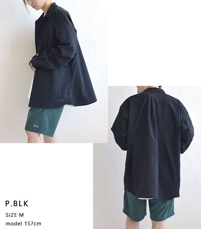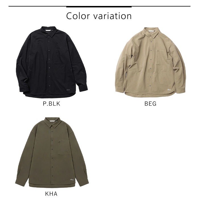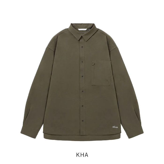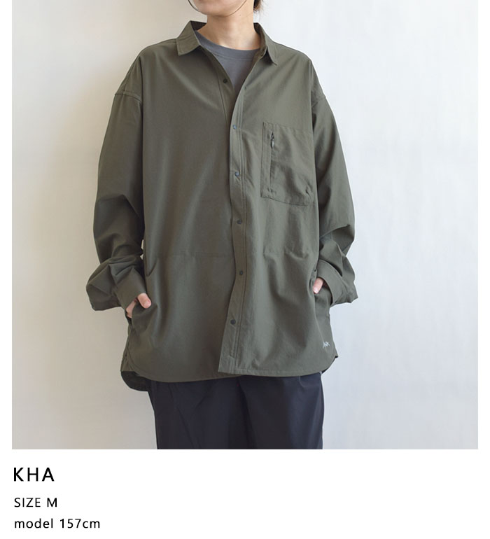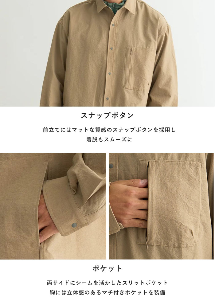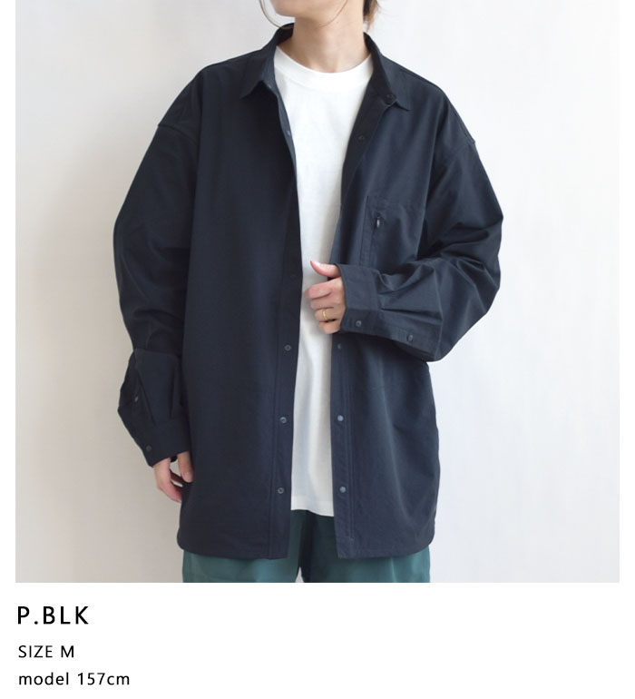 襟は小ぶりなレギュラーカラーで、上品さと涼しげな印象を両立。全体はリラックス感のあるボックスシルエットで仕上げ、シャツ1枚でも様になるデザインに。 フロントにはスナップボタンを採用し、着脱もスムーズ。マットな質感のボタンがカジュアルすぎず、落ち着いた印象をプラスしています。 両サイドにはシームを活かしたスリットポケットを配し、外出時のちょっとした収納にも対応。胸ポケットはマチ付きで収納力もあり、実用性とデザイン性を兼ね備えています。 同素材のパンツやショーツと合わせてセットアップでの着用もおすすめ。都会的な抜け感とアウトドアの機能美を兼ね備えた、夏に頼れる1着です。 DotAir (ドットエア)・・・ |