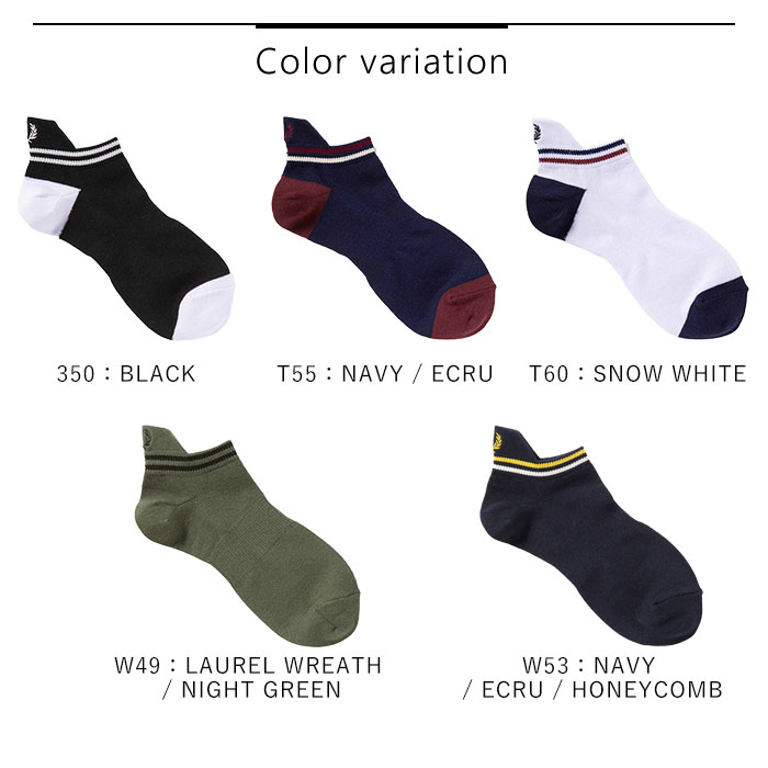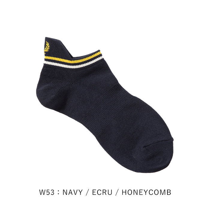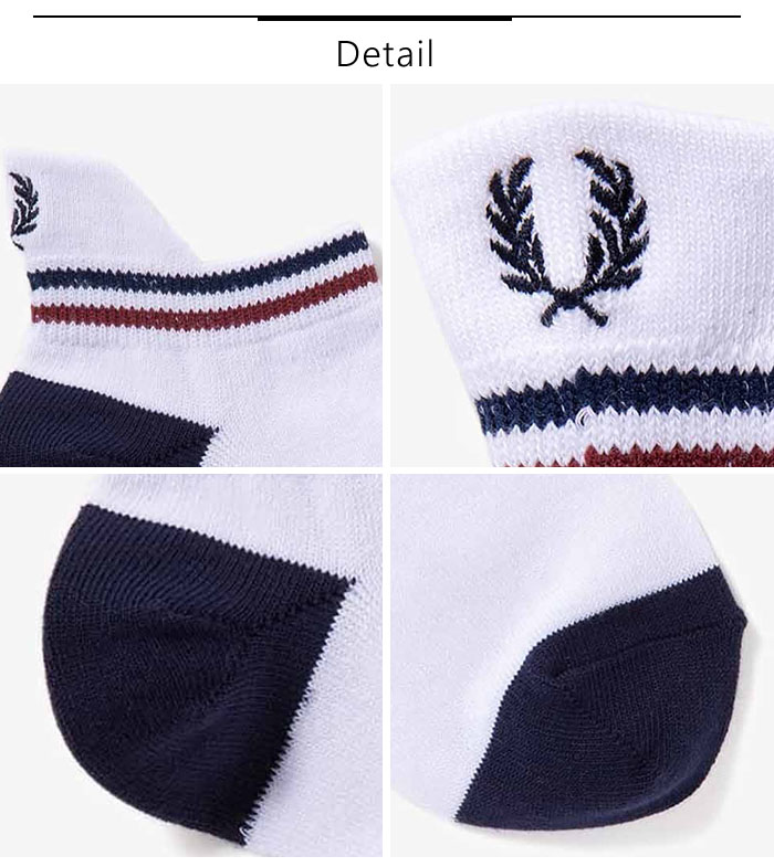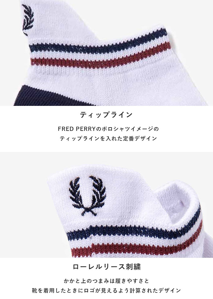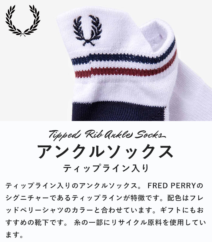 商品説明 ティップライン入りのアンクルソックス。 FRED PERRYのシグニチャーであるティップラインが特徴です。配色はフレッドペリーシャツのカラーと合わせています。ギフトにもおすすめの靴下です。 糸の一部にリサイクル原料を使用しています。
