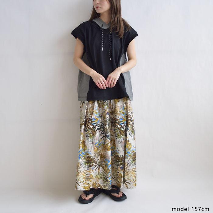 フレンチスリーブで着になるところをカバーし、アームホールは少しゆったり取っているので、レジャーなどにも◎