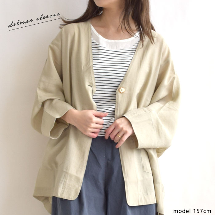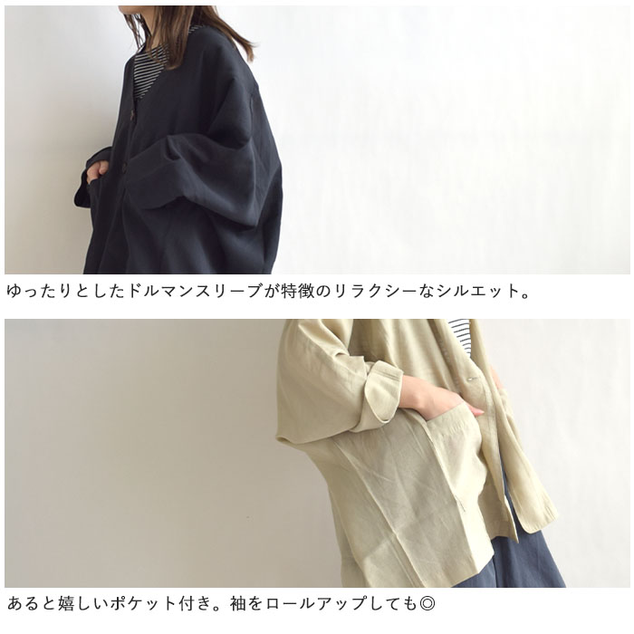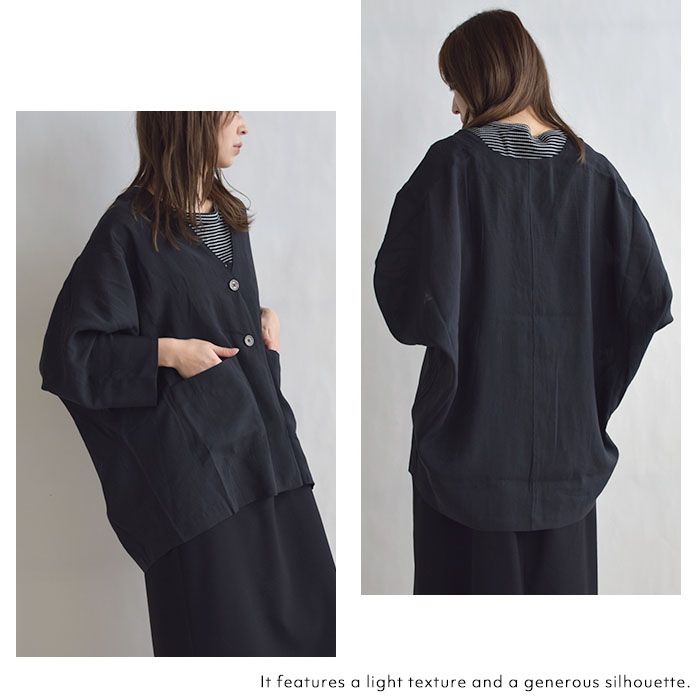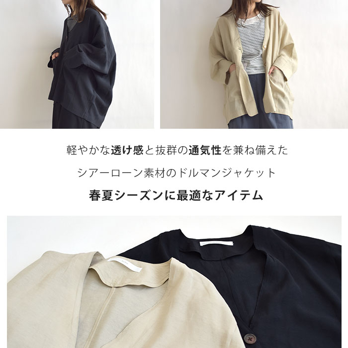 やかな透け感と抜群の通気性を兼ね備えた シアーローン素材のドルマンジャケット。 柔らかくしなやかなローン生地に、セルロース混の自然な光沢とドライタッチを ゆったりとしたドルマンスリーブが特徴のリラクシーなシルエットは、 腰まですっぽりと覆う絶妙な丈感で、パンツにもスカートにもバランスよくマッチ。 |