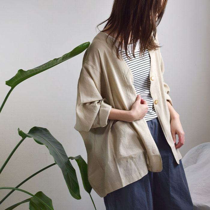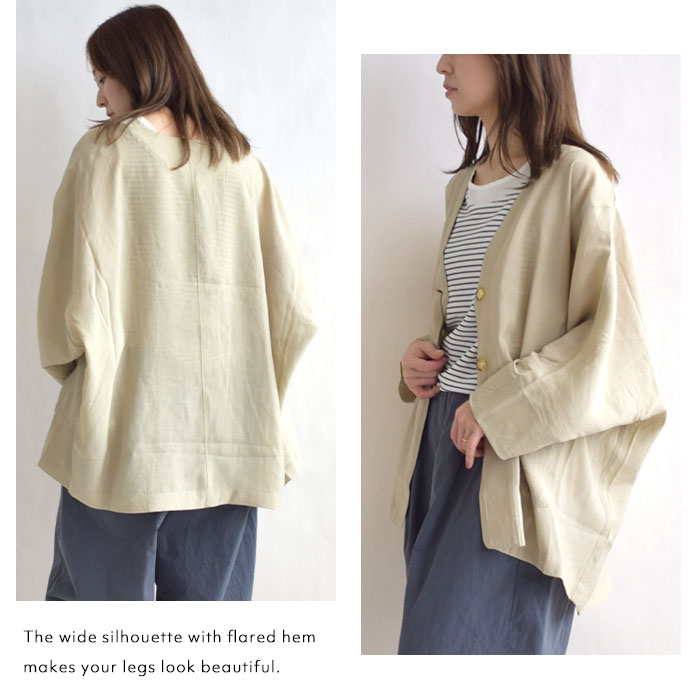 広めの身幅とドロップショルダーにより、カーディガン感覚でラフに羽織れつつも、