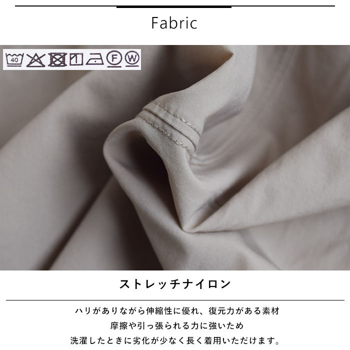 ナイロンに伸縮性を持たせた素材です。ハリがありながら伸縮性に優れ、復元力があるのが特徴です。?