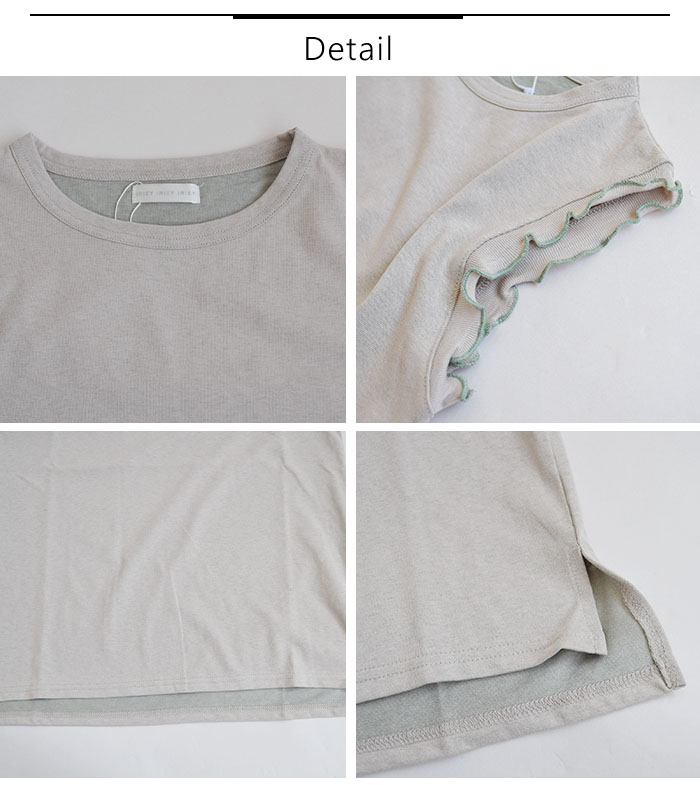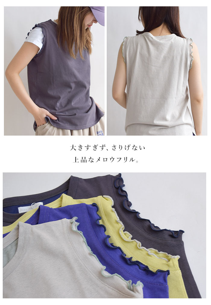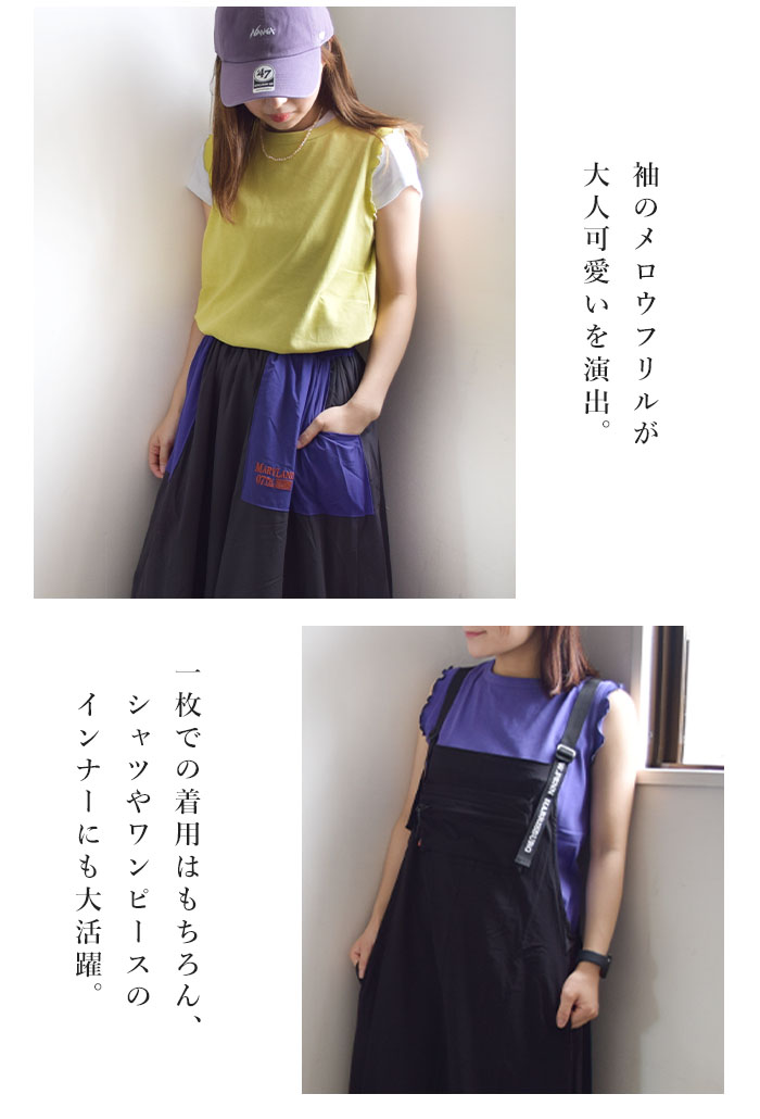 袖部分ののさりげないメローフリルが大人可愛いデザイン。